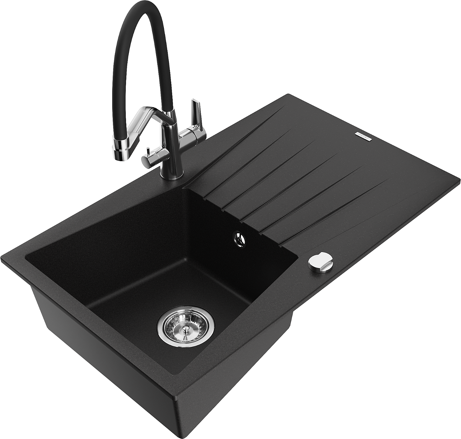 Mexen Cesar fregadero de granito de 1 cubeta con escurridor y grifo de cocina Duo, negro - 6514-77-671701-07