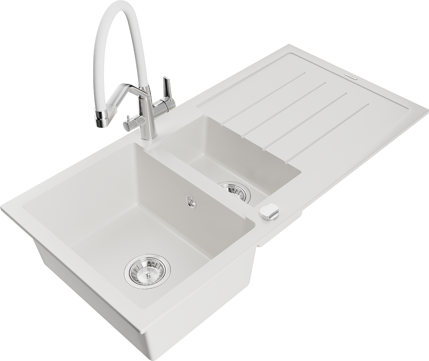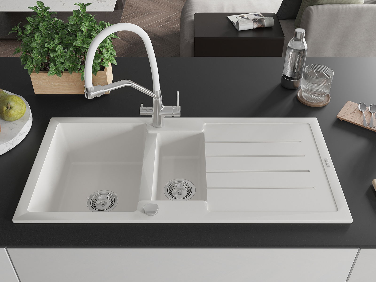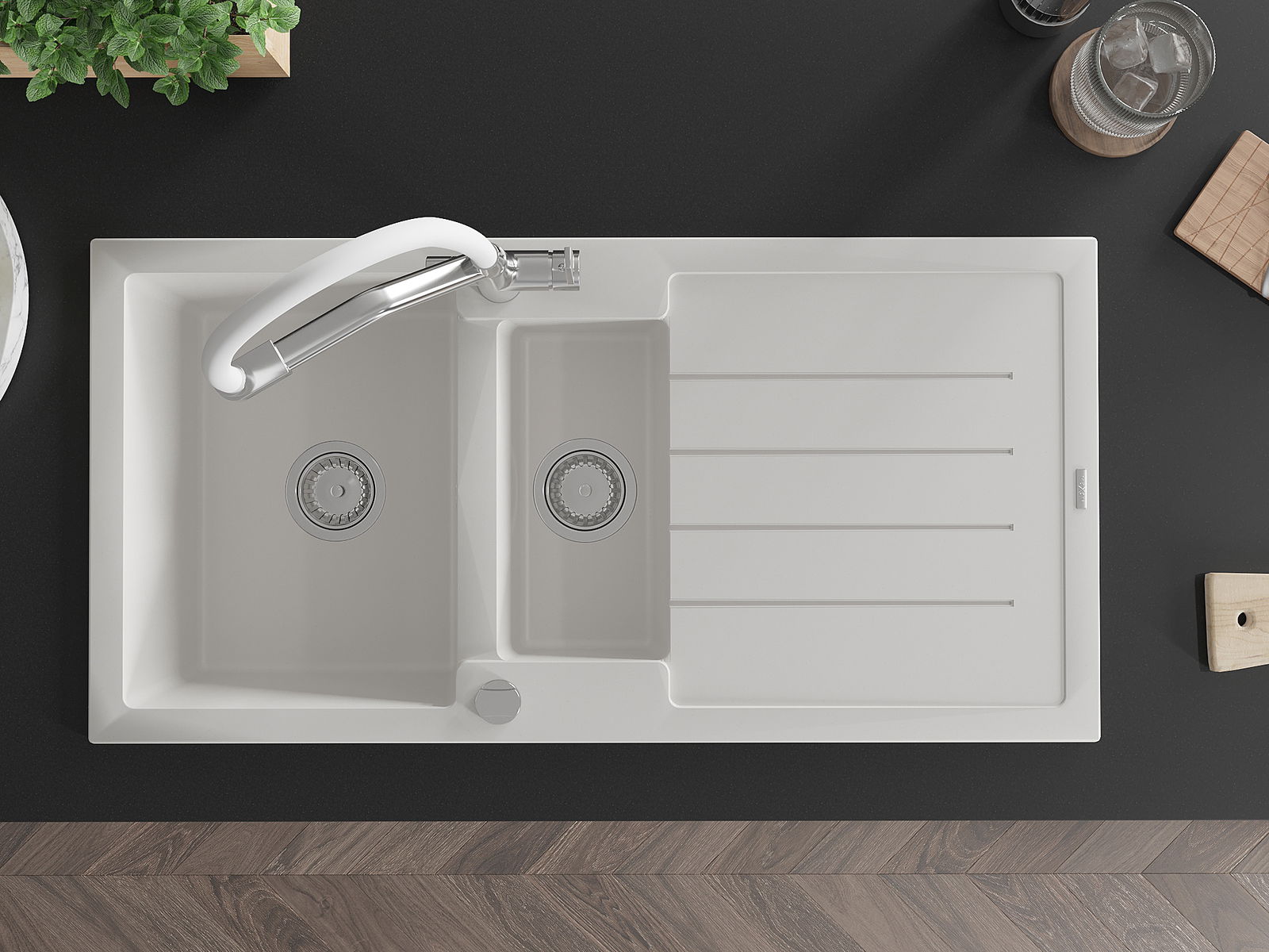 Mexen Andres fregadero de granito de 1,5 senos con escurridor y grifo de cocina Duo, blanco - 6515-20-671701-02
