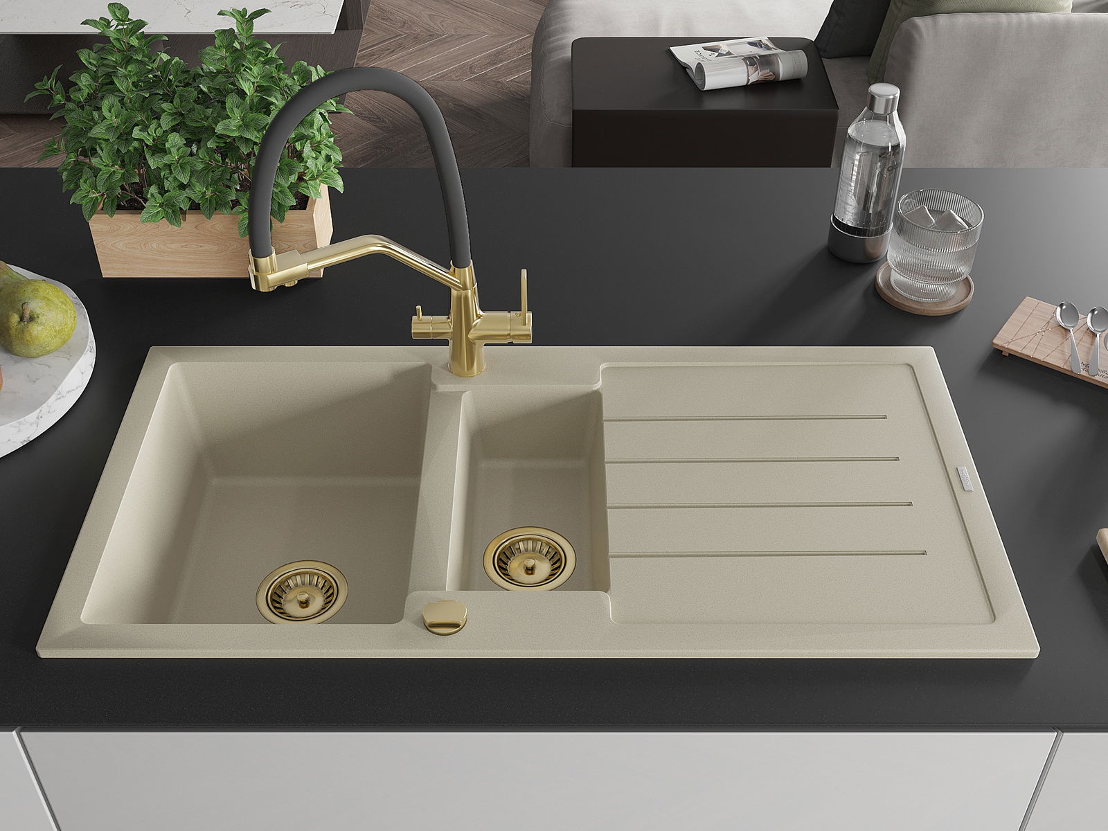 Mexen Andres fregadero de granito 1,5 senos con escurridor y grifo de cocina Duo, beige - 6515-69-671701-57-G