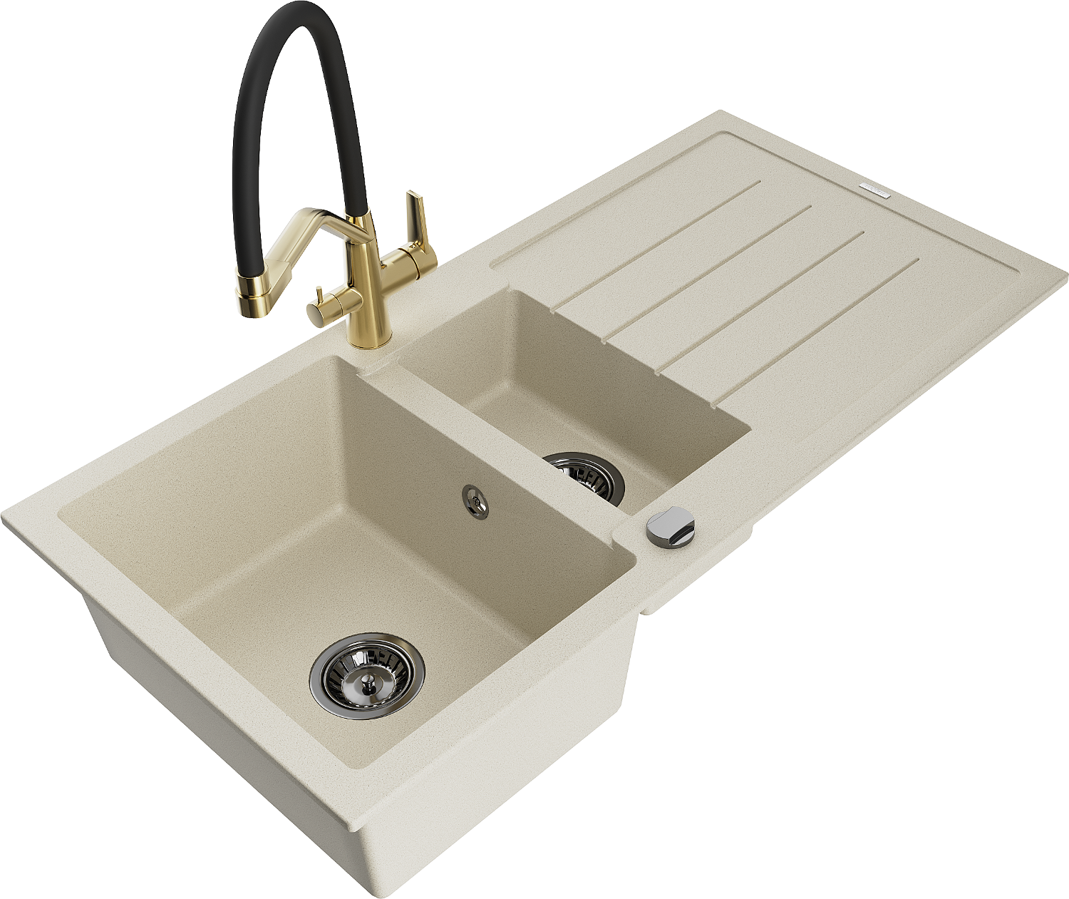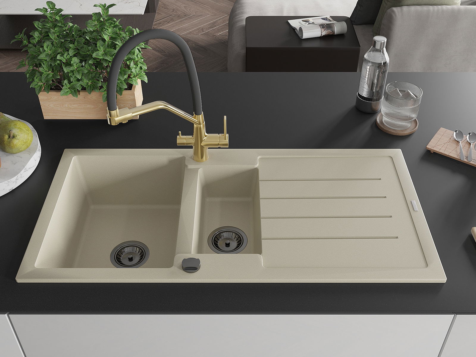 Mexen Andres fregadero de granito de 1,5 cubetas con escurridor y grifo de cocina Duo, beige - 6515-69-671701-57-B