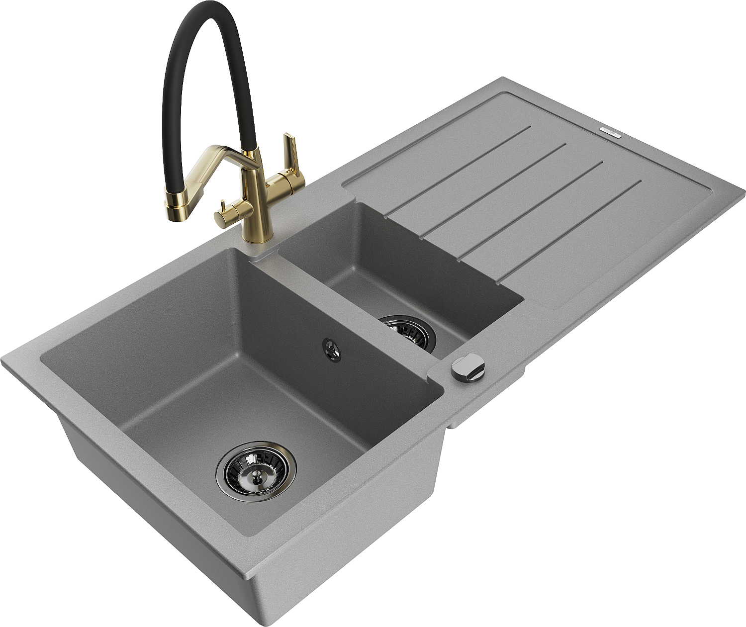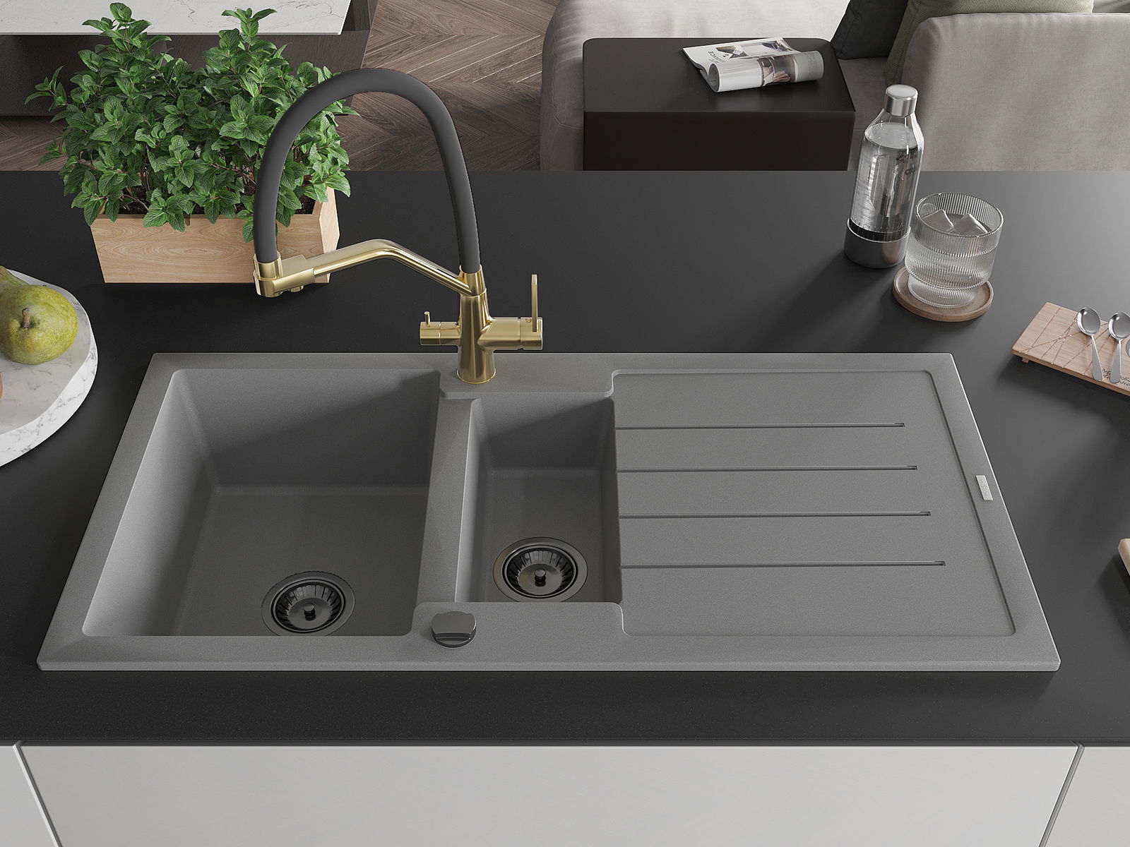 Mexen Andres fregadero de granito de 1,5 senos con escurridor y grifo de cocina Duo, gris - 6515-71-671701-57-B