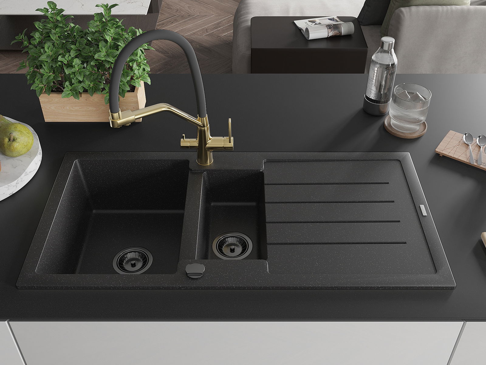El fregadero está hecho de granito de alta calidad. Constituye un complemento elegante y, sobre todo, práctico para cualquier cocina, independientemente de su estilo. La alta calidad y durabilidad del granito aseguran un uso durante muchos años.