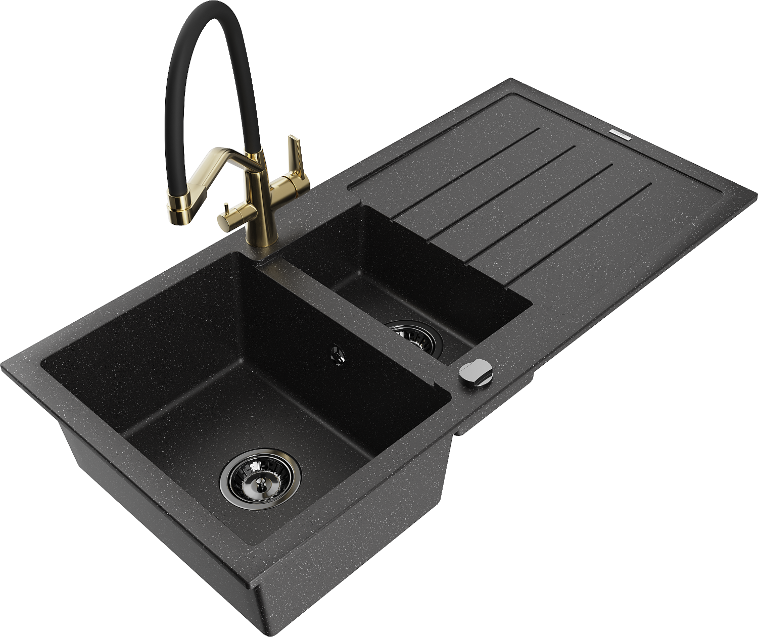 Mexen Andres fregadero de granito de 1,5 senos con escurridor y grifo de cocina Duo, negro/plata - 6515-73-671701-57-B