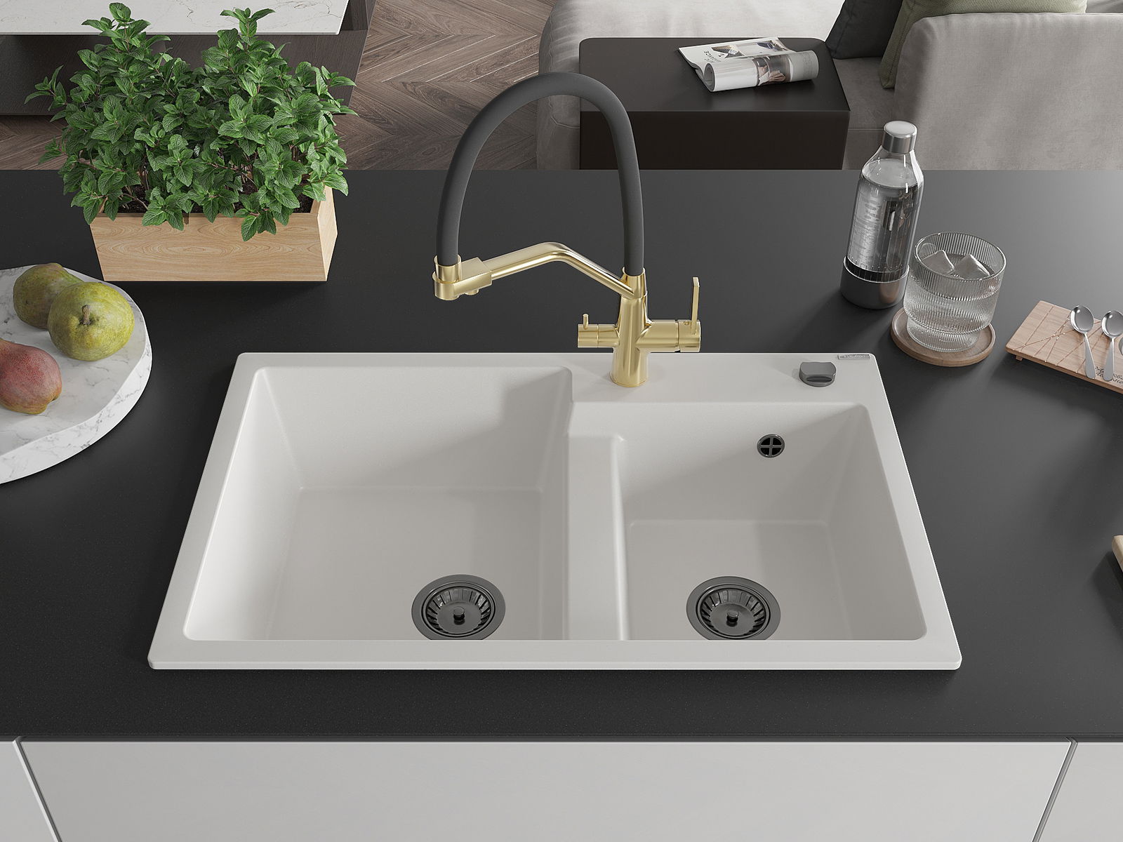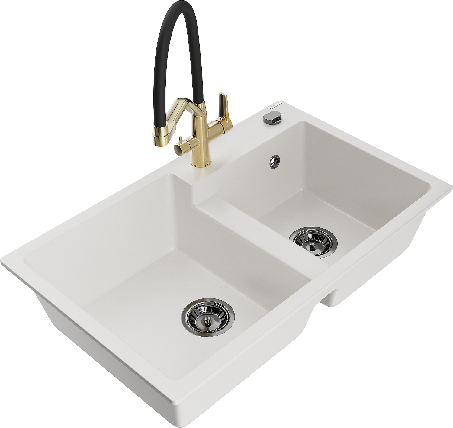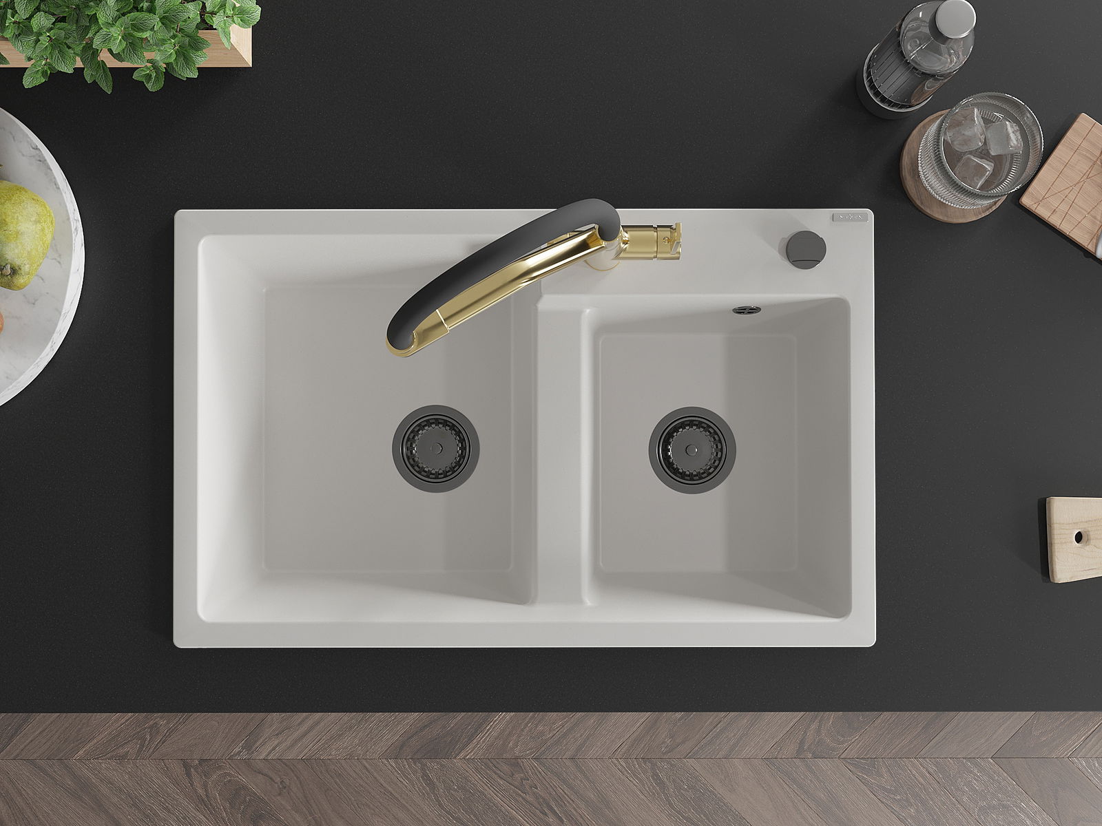 Mexen Tomas fregadero de granito de 2 compartimentos con grifo de cocina Duo, blanco - 6516-20-671701-57-B