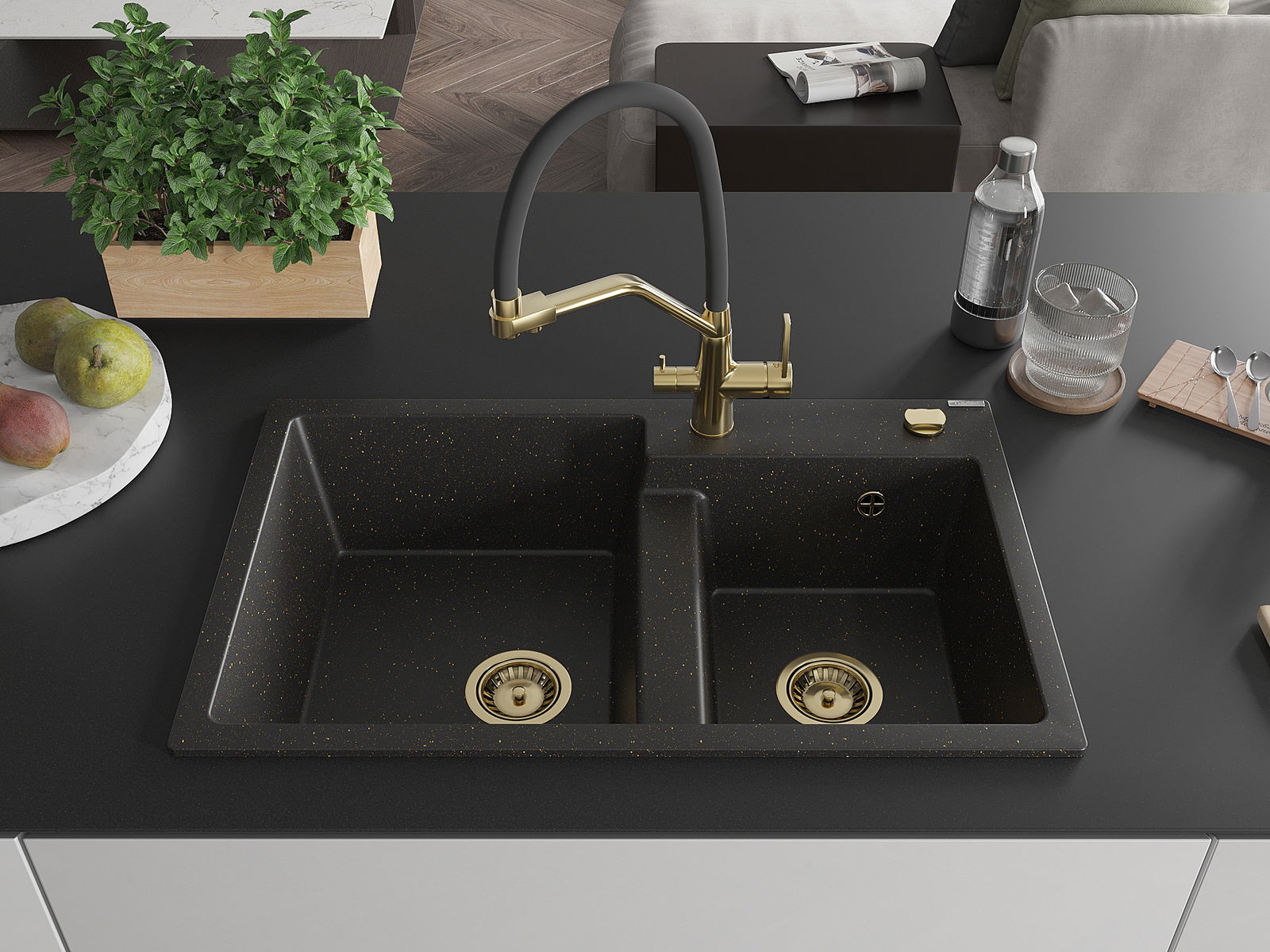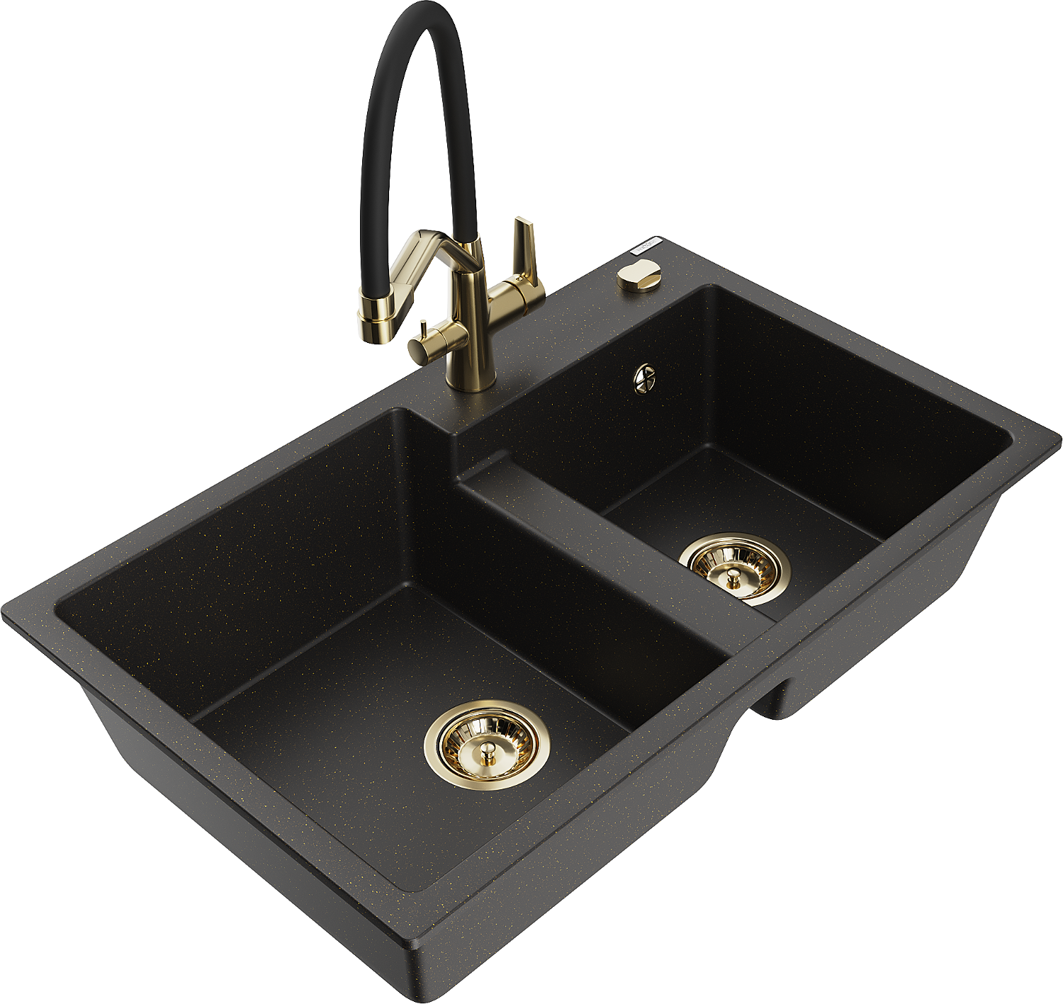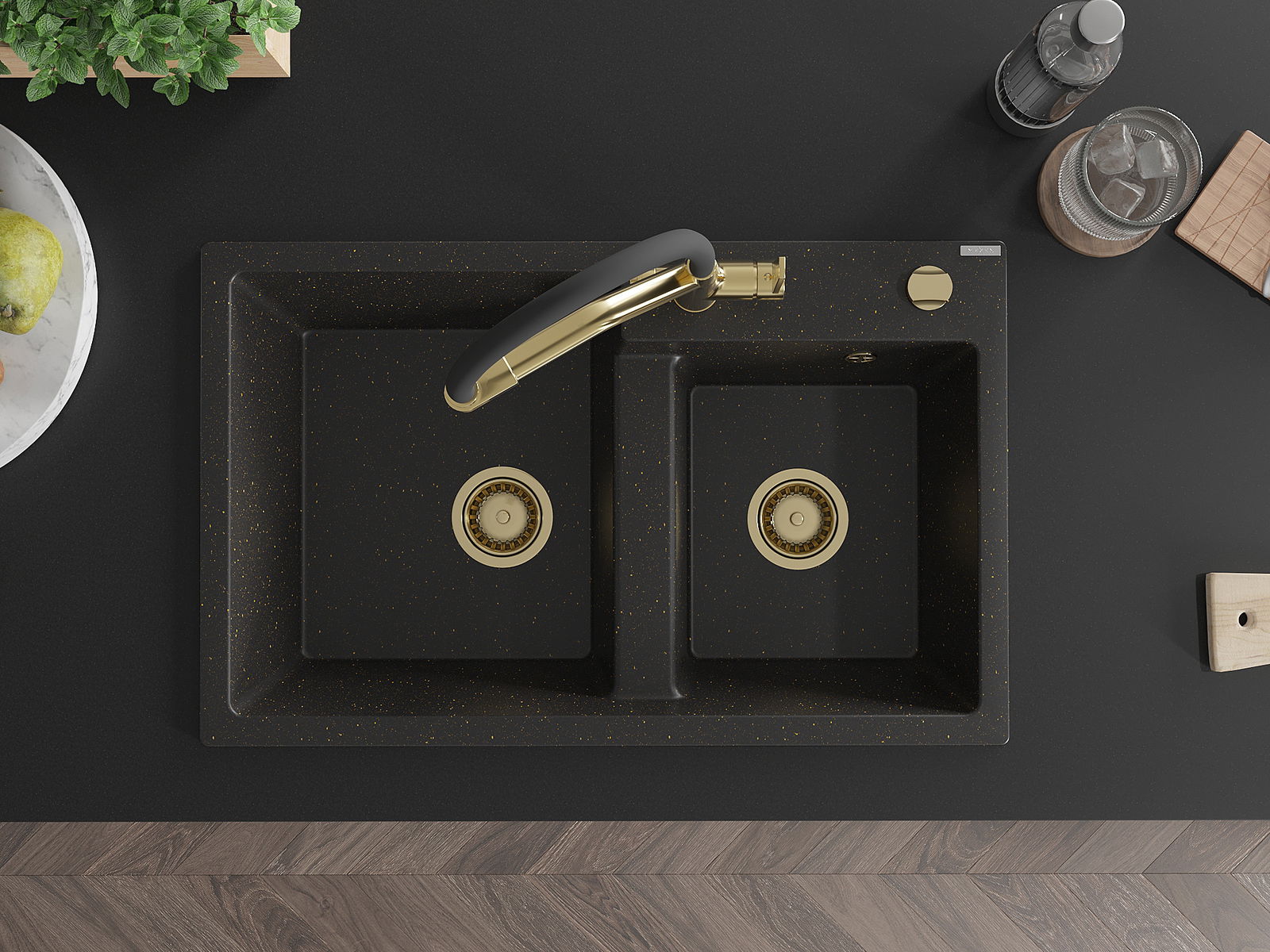 Mexen Tomas fregadero de granito de 2 compartimentos con grifo de cocina Duo, negro/dorado metálico - 6516-75-671701-57-G