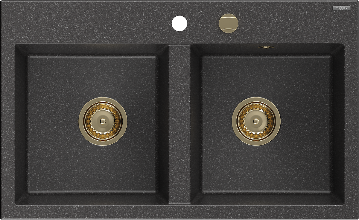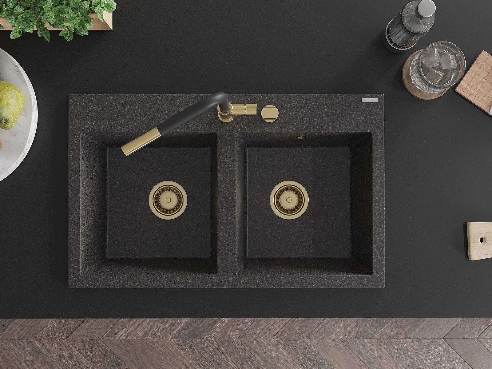 Mexen Hektor fregadero de granito de 2 senos 800 x 480 mm, negro salpicado, sifón dorado - 6521802000-76-G