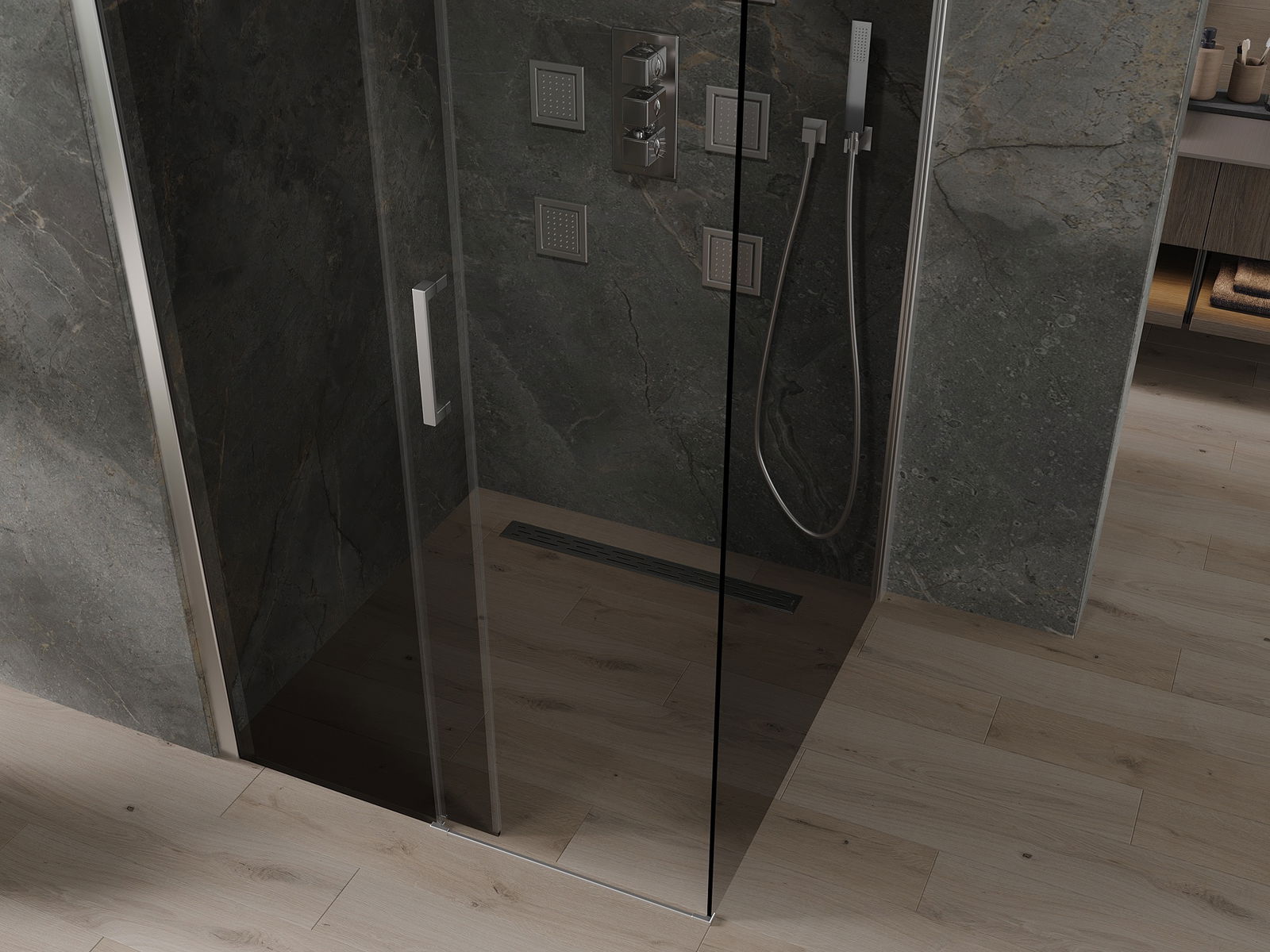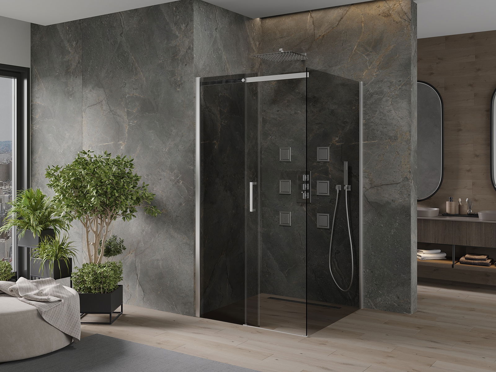 Las puertas correderas se mueven sobre guías especiales y no requieren espacio adicional para abrirse, por lo que son adecuadas para baños más pequeños. Gracias a los rodillos dobles con cuerpo metálico, su movimiento es suave.