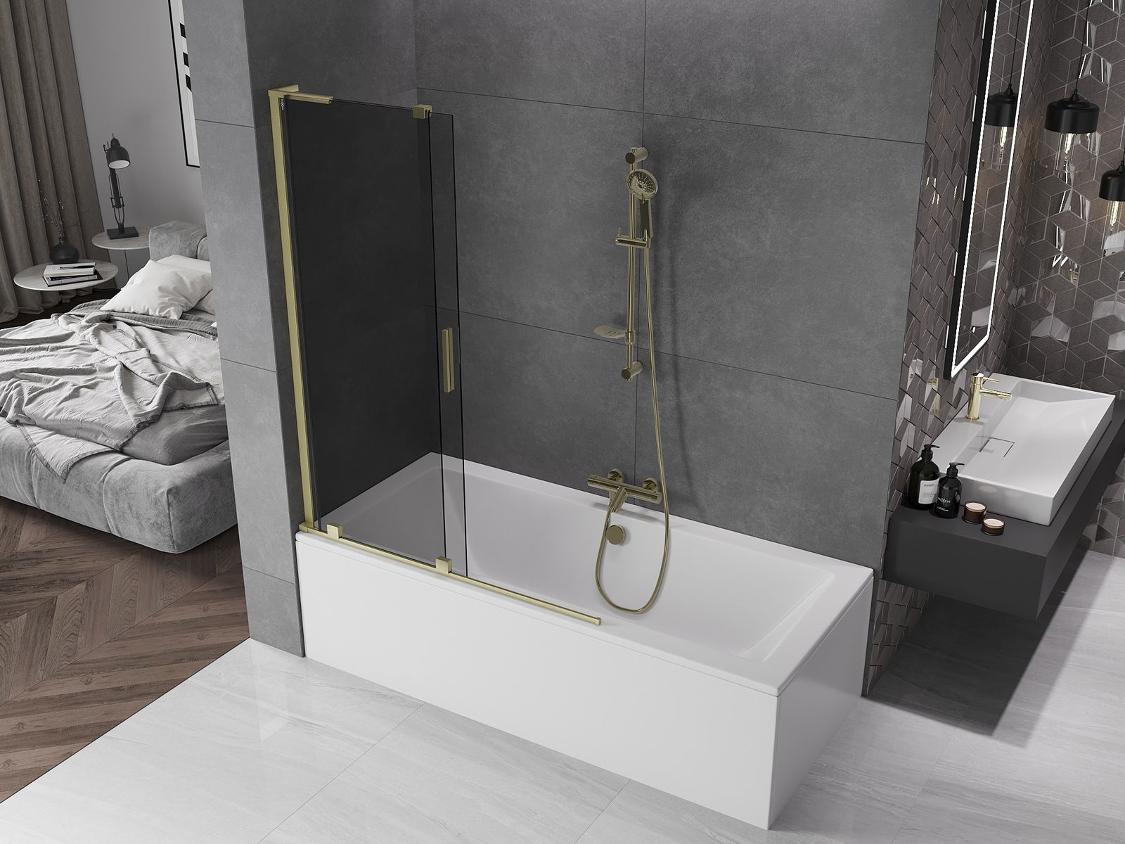Mexen Velar L mampara de bañera 2-paneles corredera 120 x 150 cm, grafito, dorado cepillado - 896-120-003-41-55