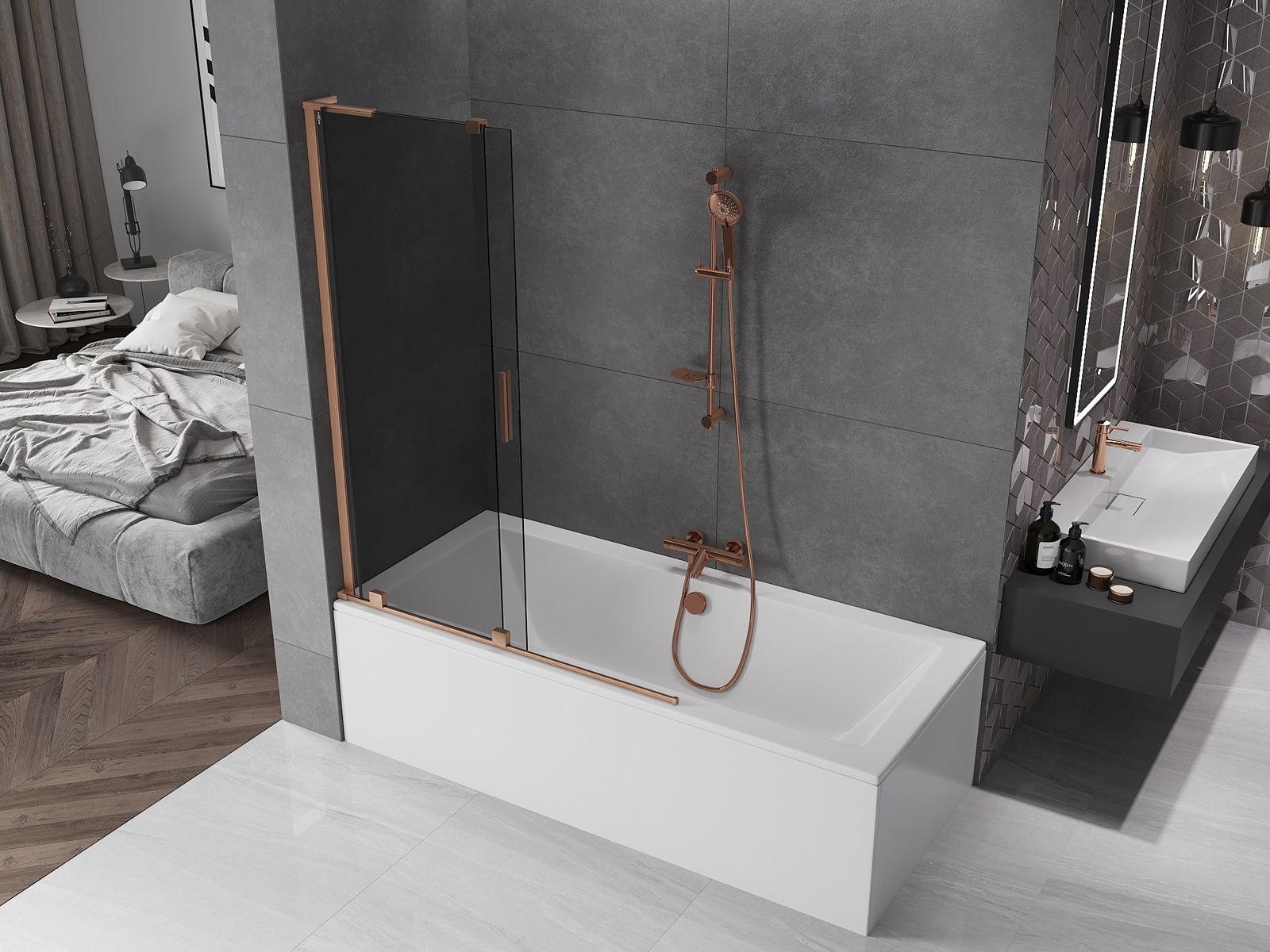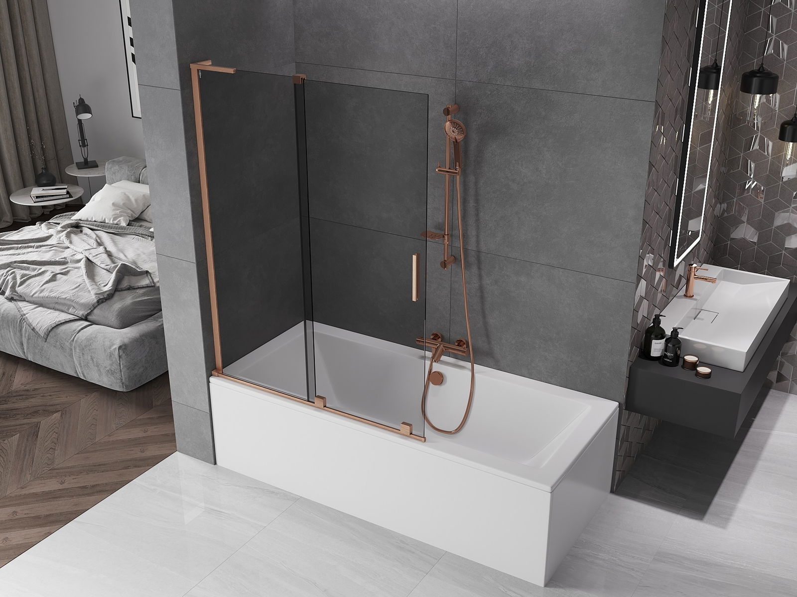 Mexen Velar L mampara de bañera de 2 paneles correderos 120 x 150 cm, grafito, cobre cepillado - 896-120-003-41-65
