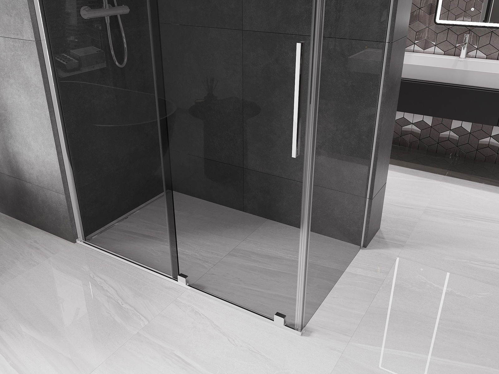 El práctico y cómodo asa está hecho de acero inoxidable. La forma moderna combinada con un acabado a juego con el color de los perfiles le da a todo un aspecto moderno y elegante, resaltando la estética de cada baño.