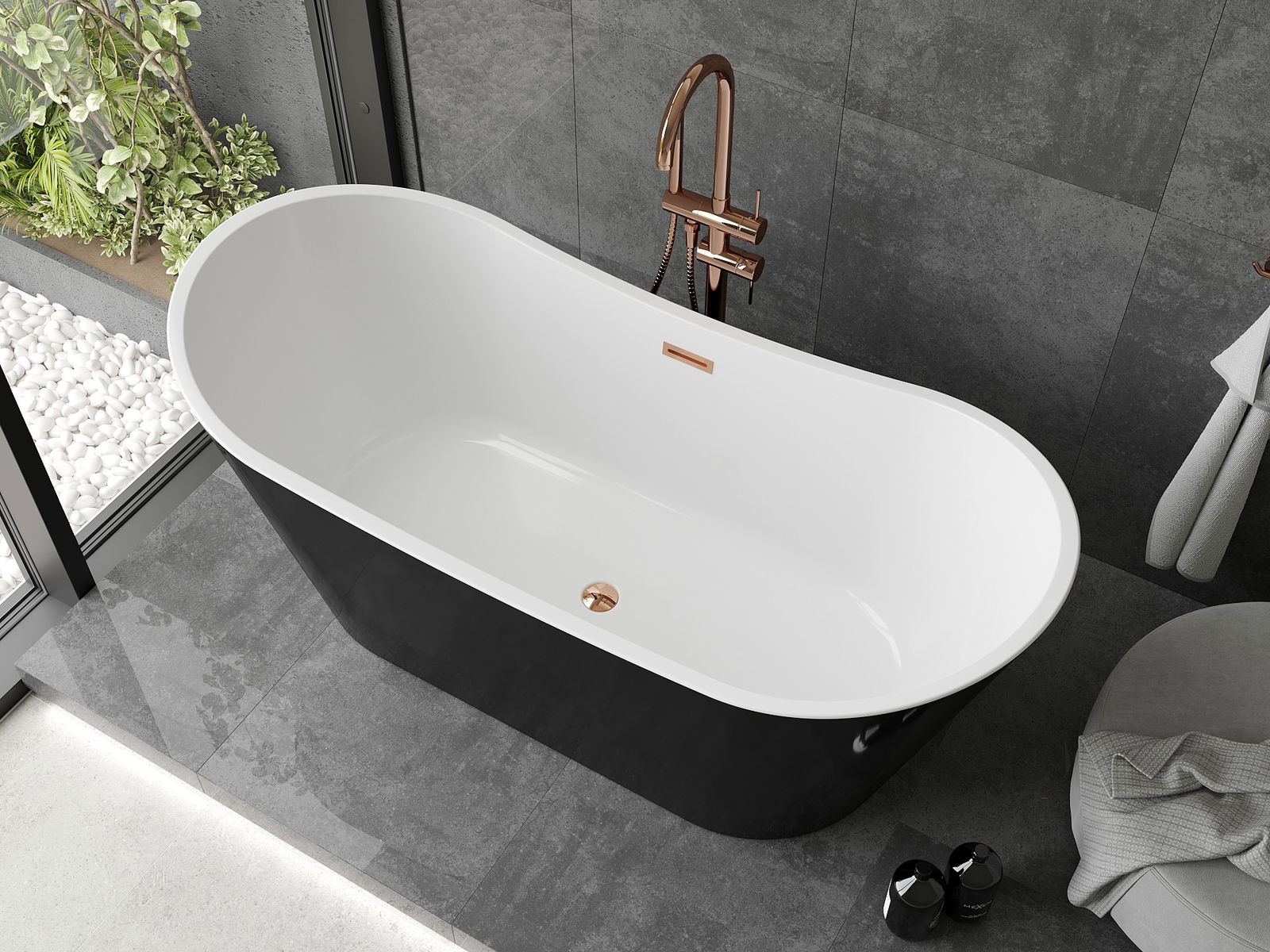 Mexen Montana bañera exenta 150 x 75 cm, blanca/negra, desbordamiento oro rosado - 52011507575-60