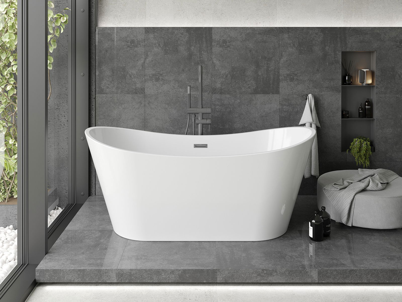 La bañera independiente con dimensiones de 180 x 80 cm es un elemento excepcional para cualquier baño. Fabricada en acrílico sanitario de color blanco elegante, garantiza durabilidad y facilidad de mantenimiento. El acabado en color gun metal añade modernidad y estilo. Su forma ovalada y la posibilidad de instalación en el centro de la habitación hacen que la bañera se integre perfectamente en diferentes arreglos. Equipada con un agujero de desbordamiento y un conjunto de sifón y tapón clic-clac, asegura comodidad y funcionalidad.