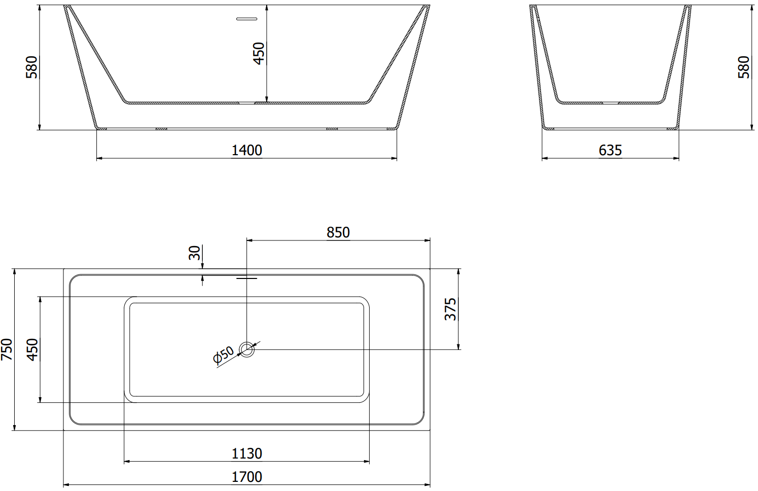 Mexen Lita bañera exenta 170 x 75 cm, blanca/negra, rebosadero negro - 52121707575-70