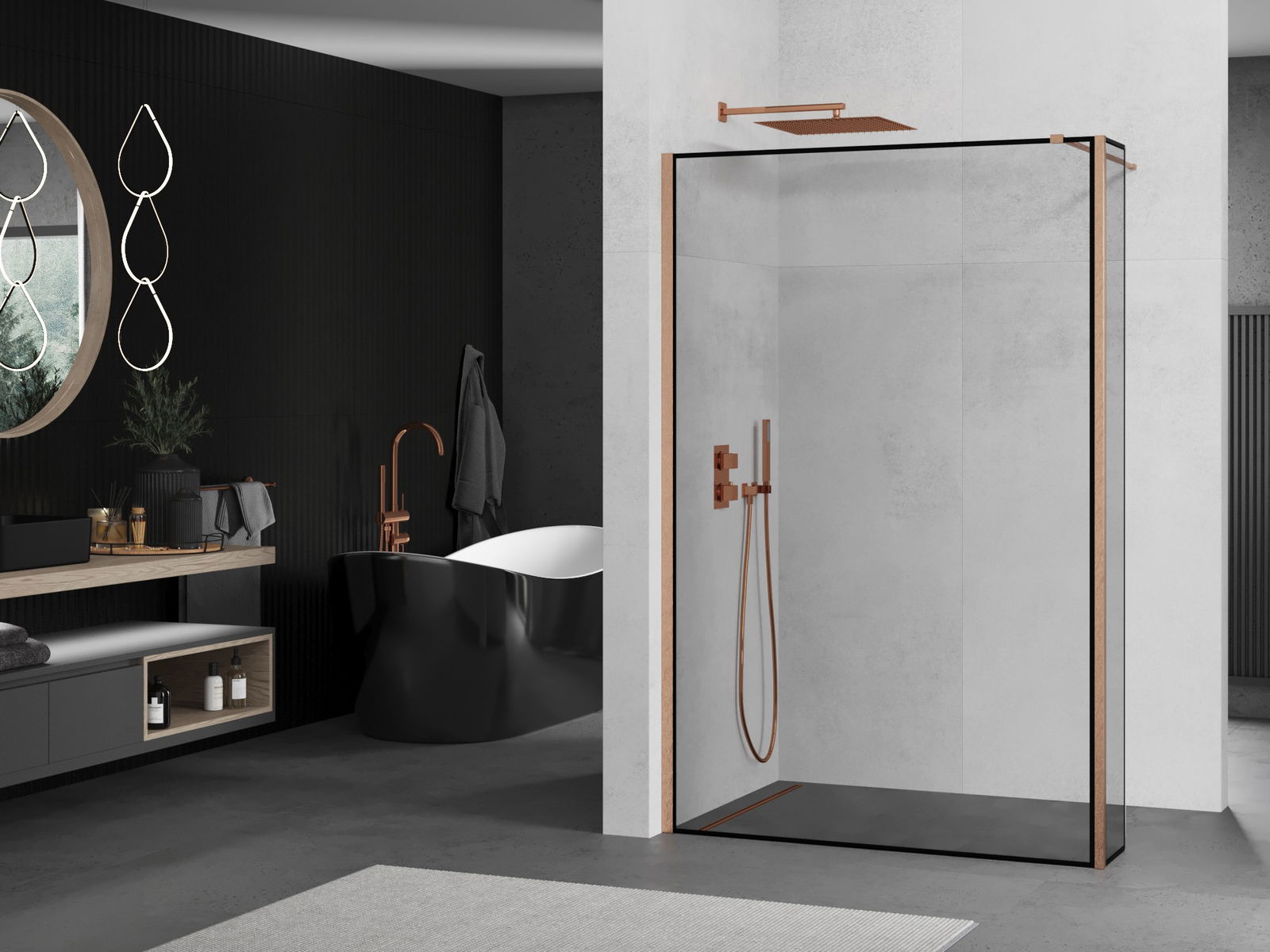 Mexen Kioto panel de ducha Walk-in 160 x 30 cm, marco negro, cobre cepillado - 800-160-212-65-70-030