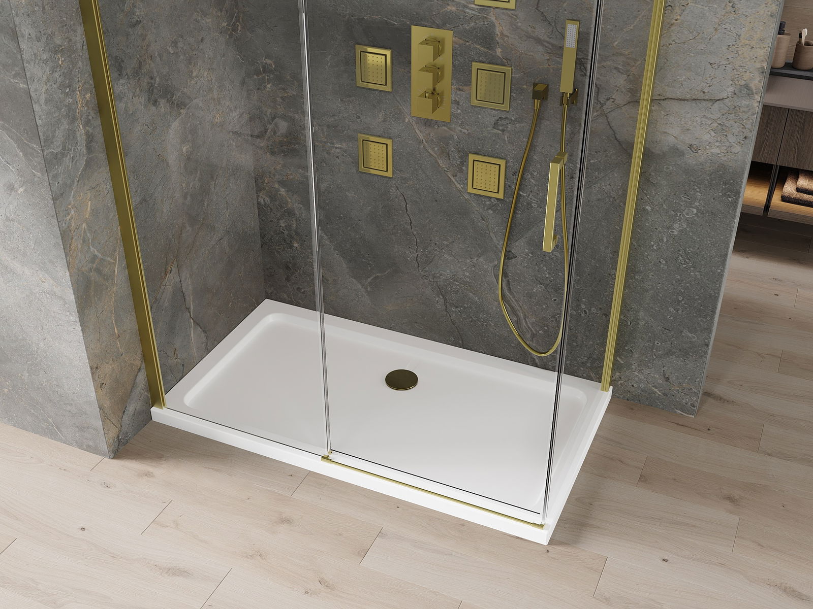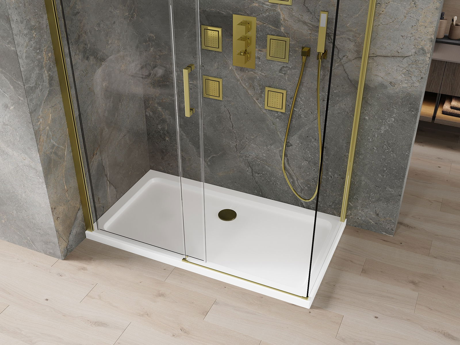 Mexen Omega cabina de ducha corredera 140 x 70 cm, transparente, dorado + plato de ducha Flat - 825-140-070-50-00-4010