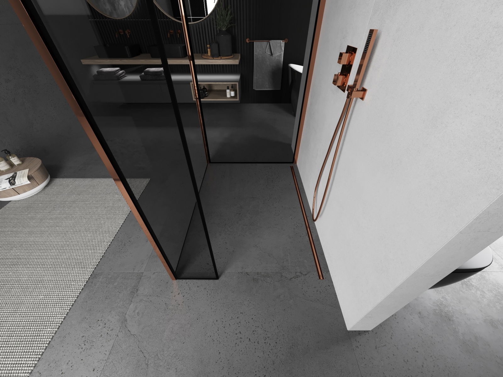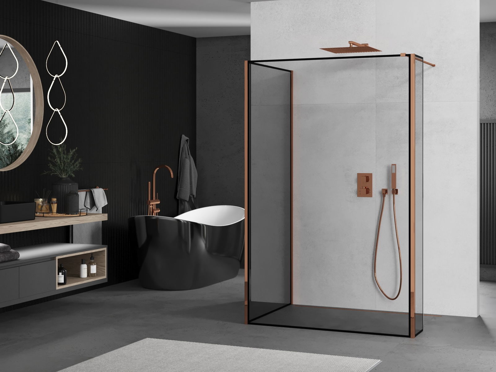Mexen Kioto panel de ducha Walk-in 90 x 90 x 30 cm, marco negro, oro rosa - 800-090-090-221-60-70-030