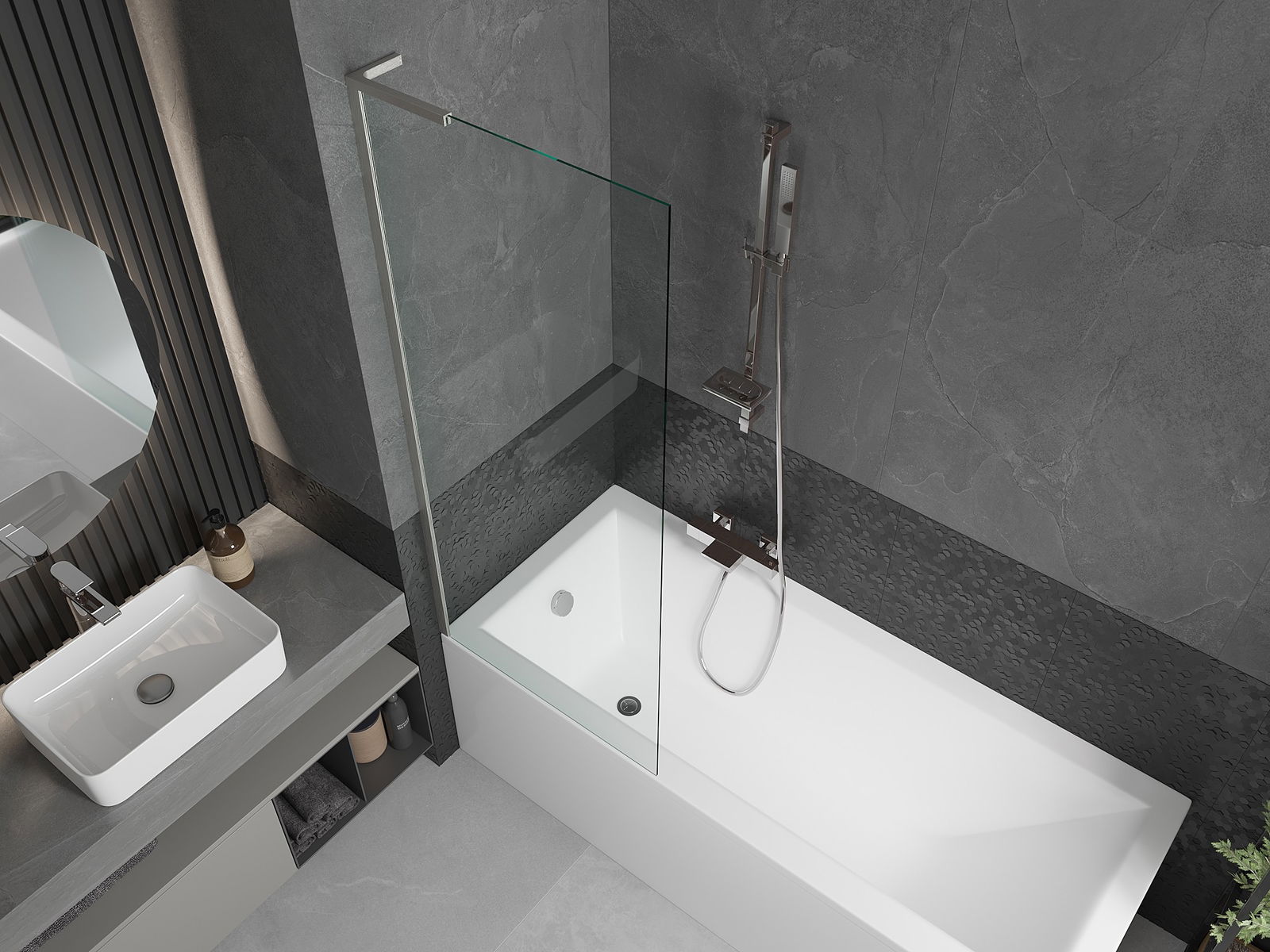 Protección efectiva contra el derrame de agua durante el baño. La mampara tiene juntas que se ajustan perfectamente a la superficie del vidrio y al borde de la bañera. Solución funcional que garantiza seguridad y facilidad de limpieza.