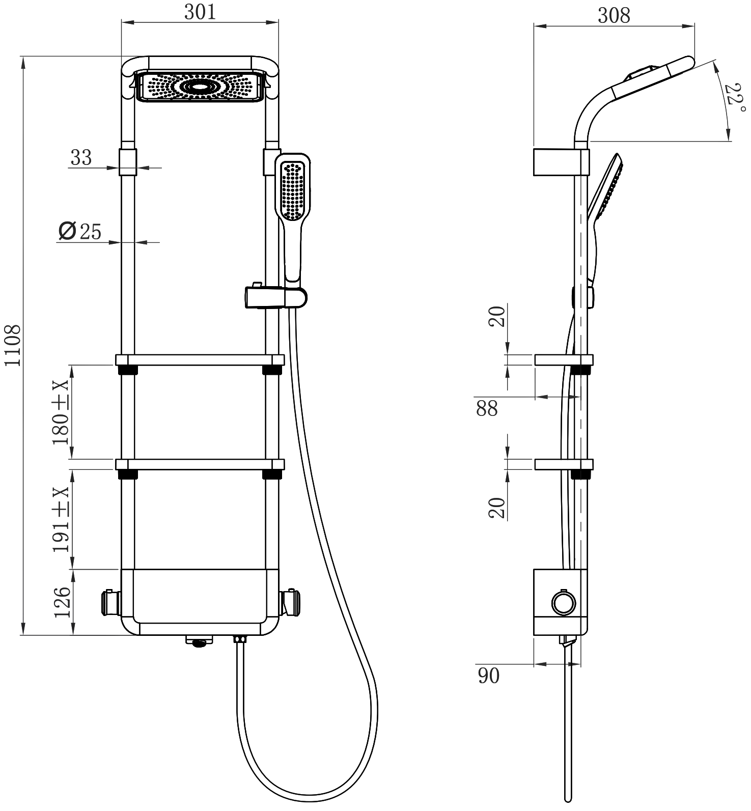 Chorro de agua estándar que imita la lluvia natural. Las gotas fluyen uniformemente sobre el cuerpo, envolviéndolo con una agradable sensación de hidratación y permitiendo sumergirse en una experiencia relajante y reconfortante para los sentidos durante el baño diario.
