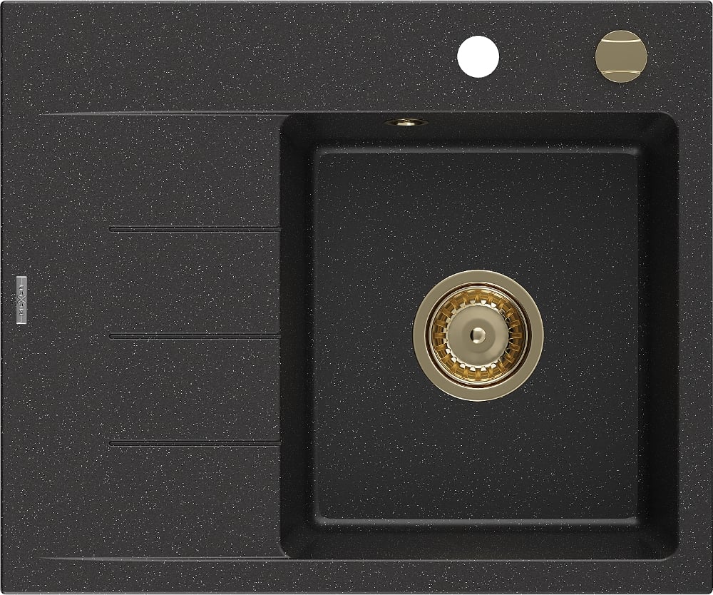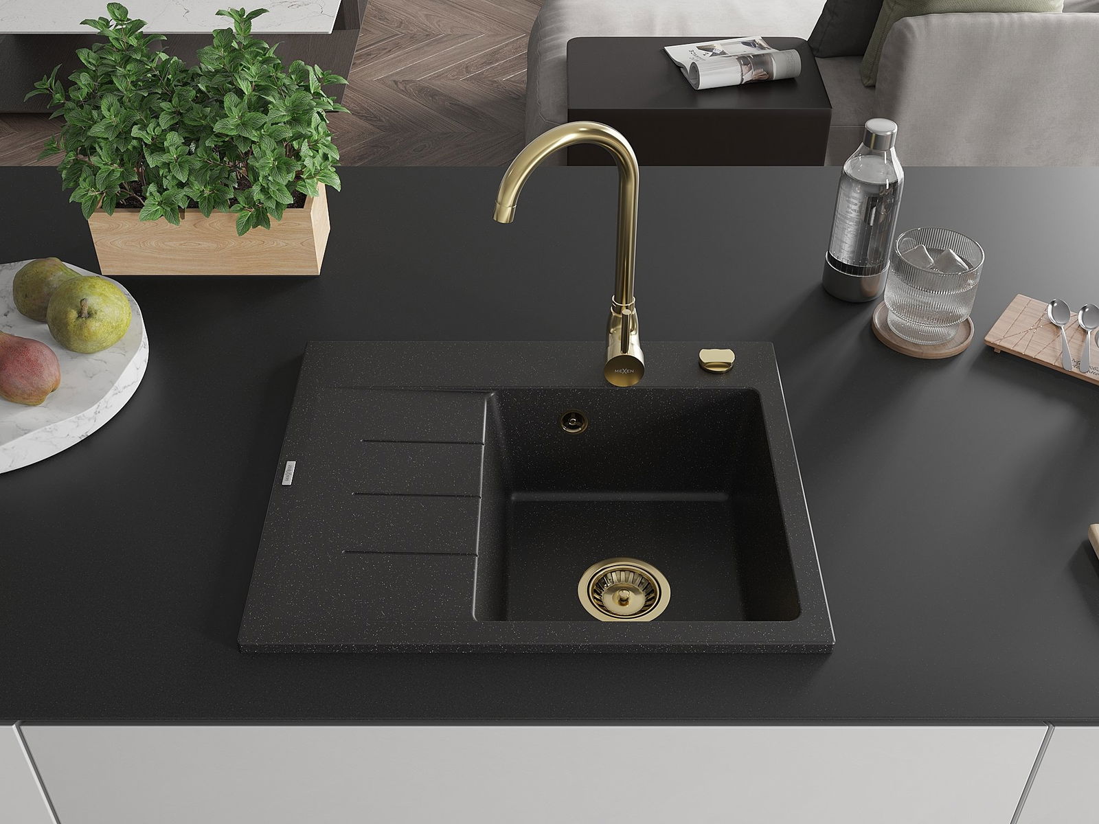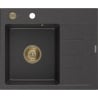 Mexen Ben fregadero de granito de 1 cubeta con escurridor, derecho 600 x 500 mm negro/metalizado plateado sifón dorado
