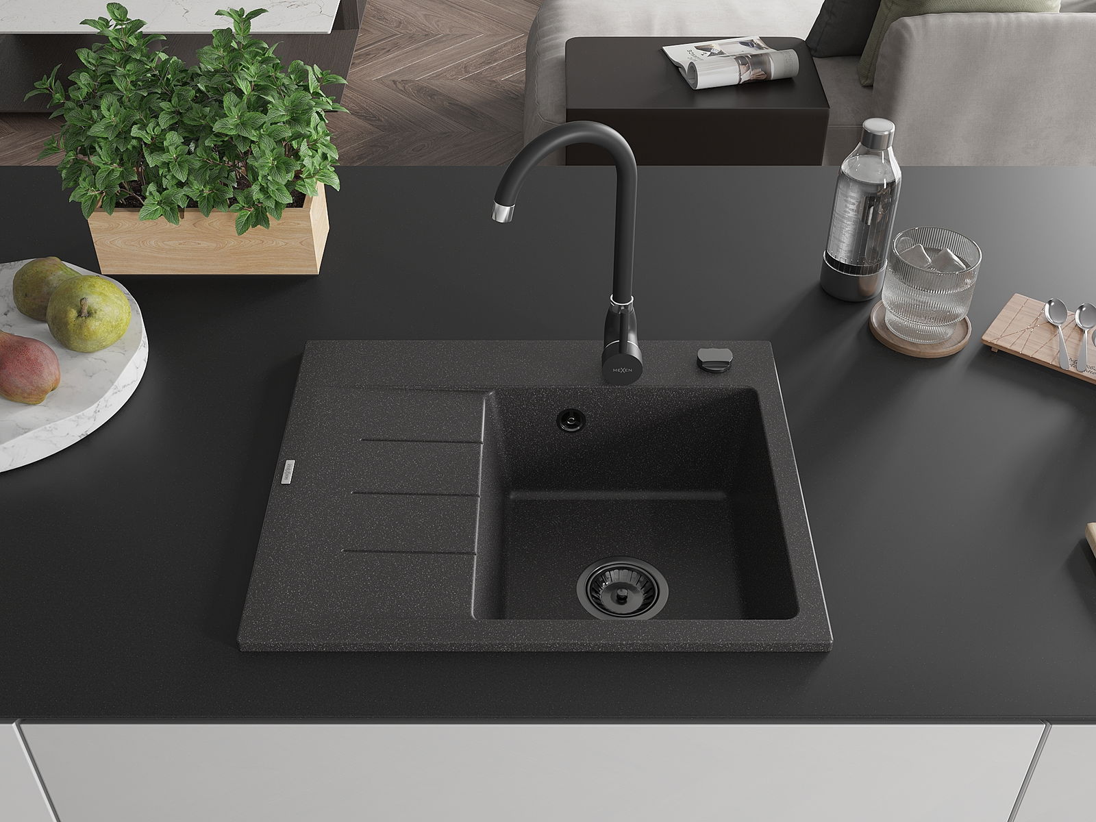 Mexen Ben fregadero de granito de 1 seno con escurridor, derecho 600 x 500 mm, negro salpicado, sifón negro - 6523605000-76-B