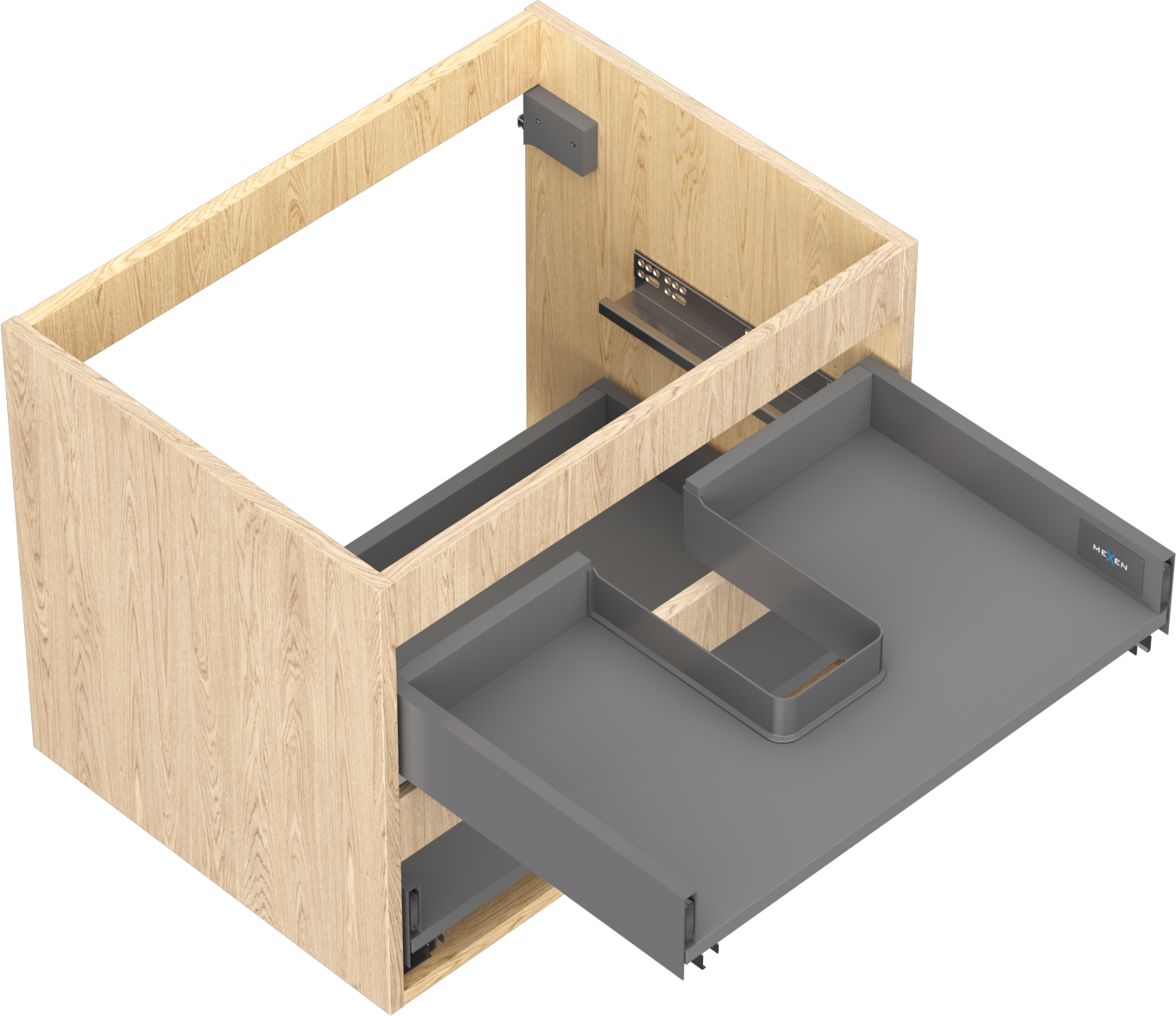 El corte en el cajón está diseñado de tal manera que pueda alojar el sifón, que es necesario en las instalaciones de lavabos. Gracias a esto, el mueble puede ser montado de manera completamente funcional, sin la necesidad de renunciar al espacio en el cajón en favor de la instalación.