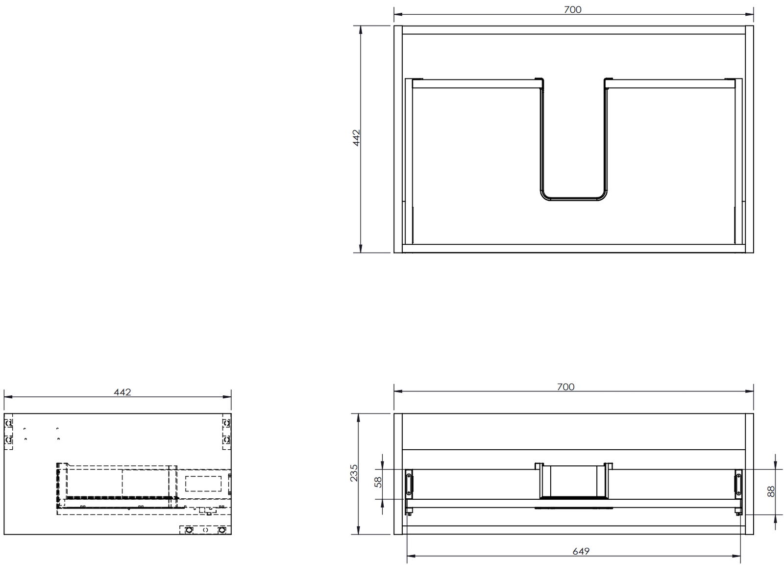El corte en el cajón está diseñado de tal manera que pueda alojar el sifón, que es necesario en las instalaciones de lavabos. Gracias a esto, el mueble puede ser montado de manera completamente funcional, sin la necesidad de renunciar al espacio en el cajón en favor de la instalación.