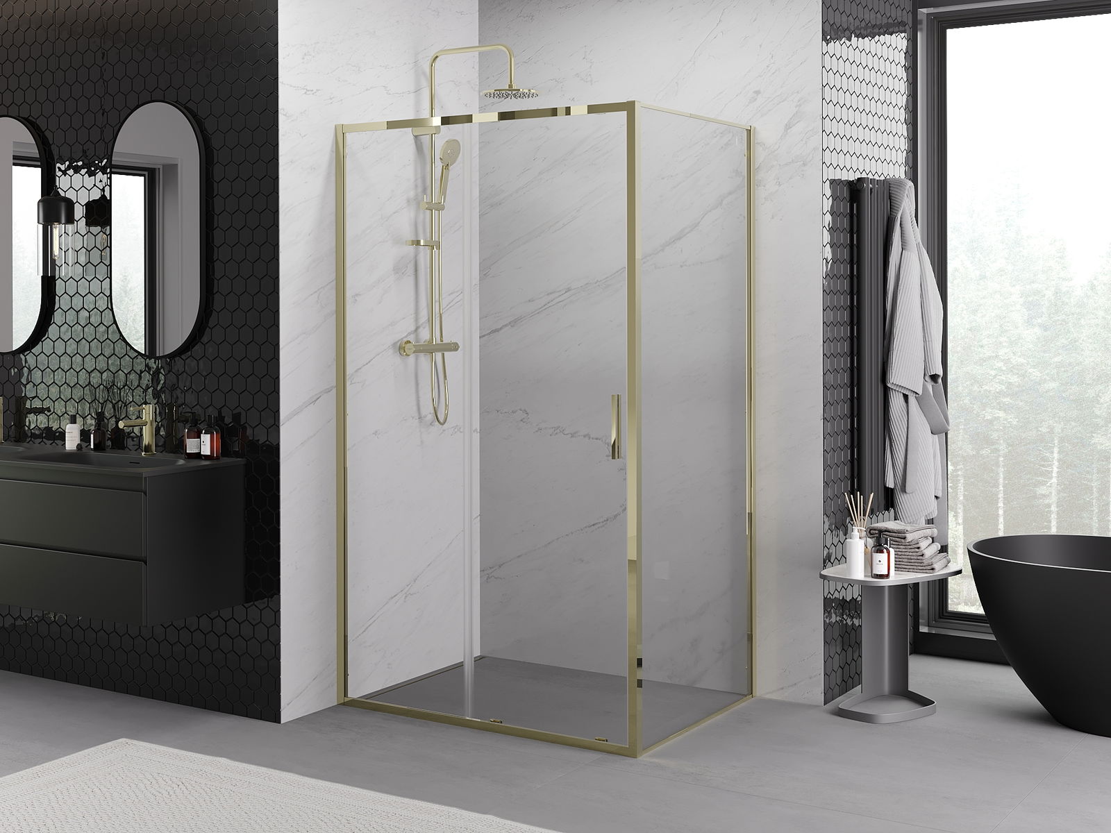 Las puertas correderas se mueven sobre guías especiales y no requieren espacio adicional para abrirse, por lo que son adecuadas para baños más pequeños. Gracias a los rodillos dobles con cuerpo metálico, su movimiento es suave.