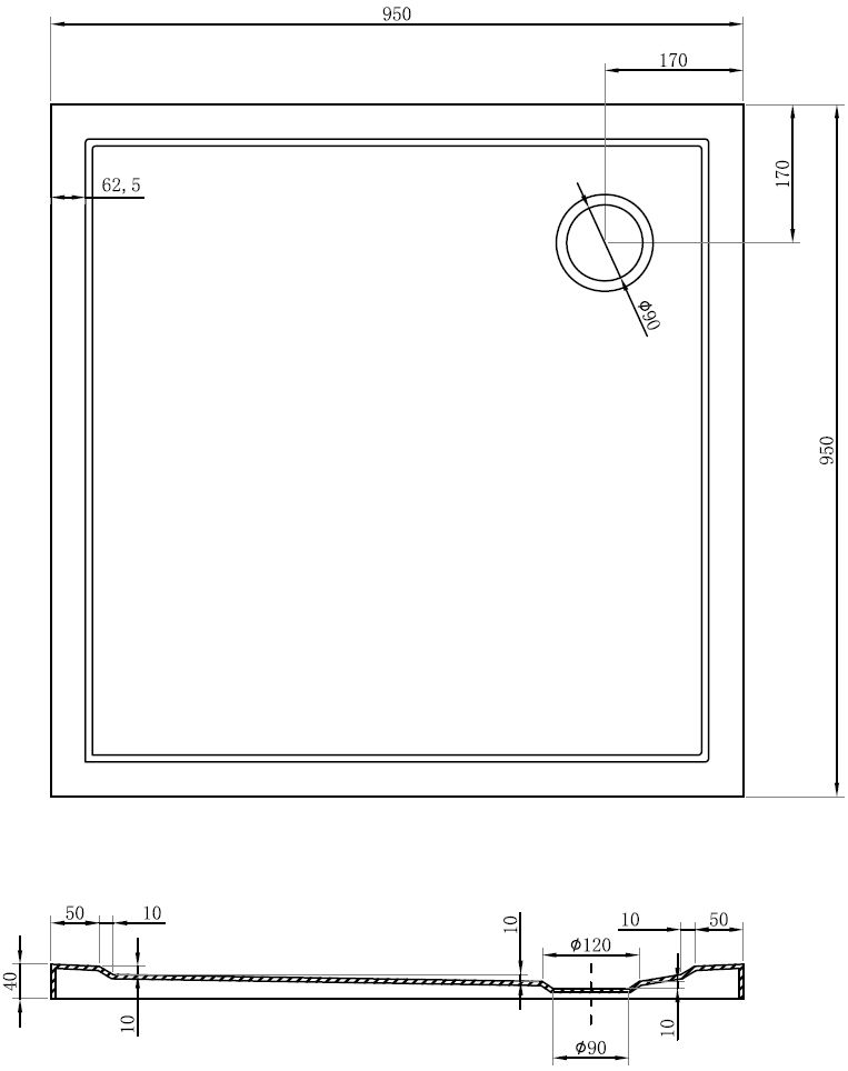 El plato de ducha fue diseñado de tal manera que el agua pueda fluir libremente hacia el desagüe. Garantiza un drenaje rápido y eficiente del agua desde la superficie del plato, previniendo la formación de charcos e inundaciones en el baño.