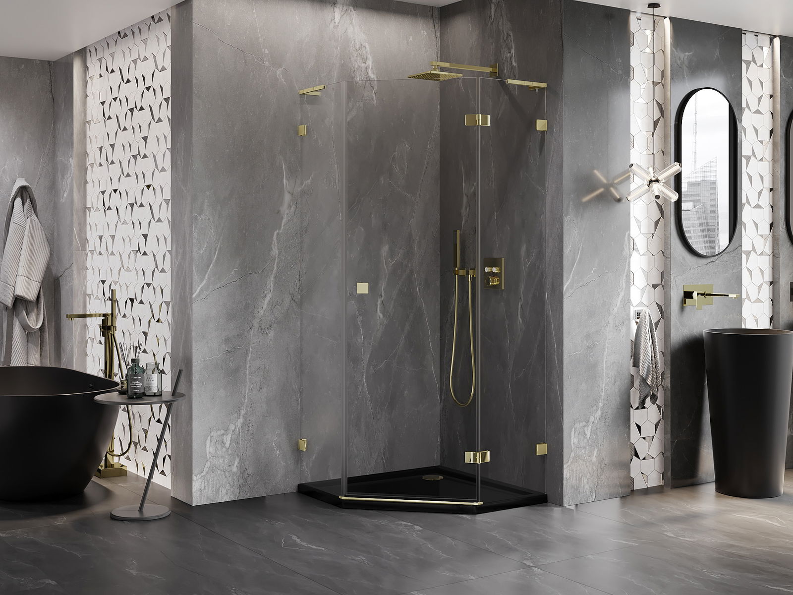 Mexen Lunar L cabina de ducha pentagonal abatible derecha 80 x 80 cm, transparente, dorada - 831L-080P-080L-50-00-P
