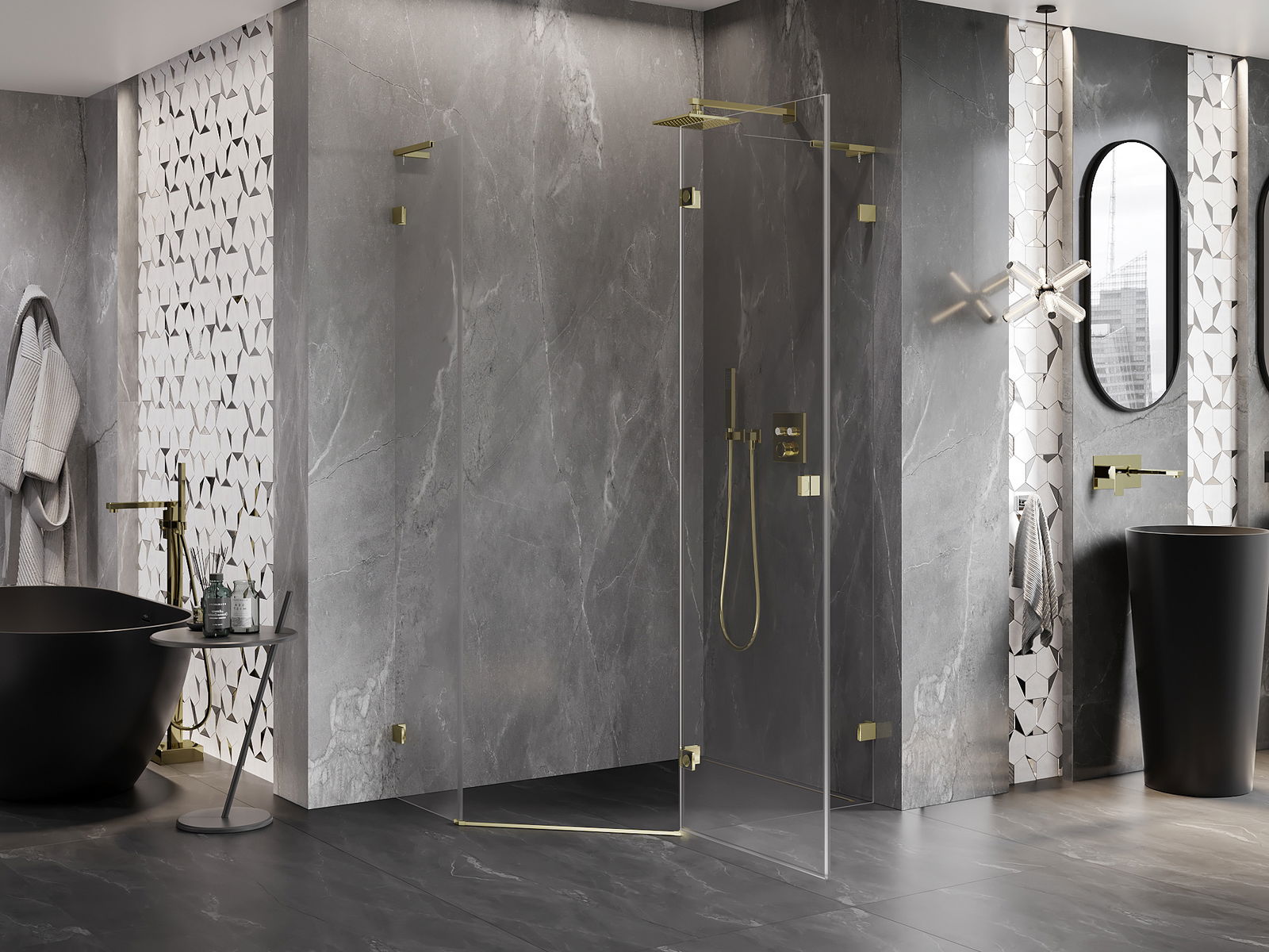 Mexen Lunar L cabina de ducha pentagonal abatible derecha 90 x 80 cm, transparente, dorado - 831L-090P-080L-50-00-P