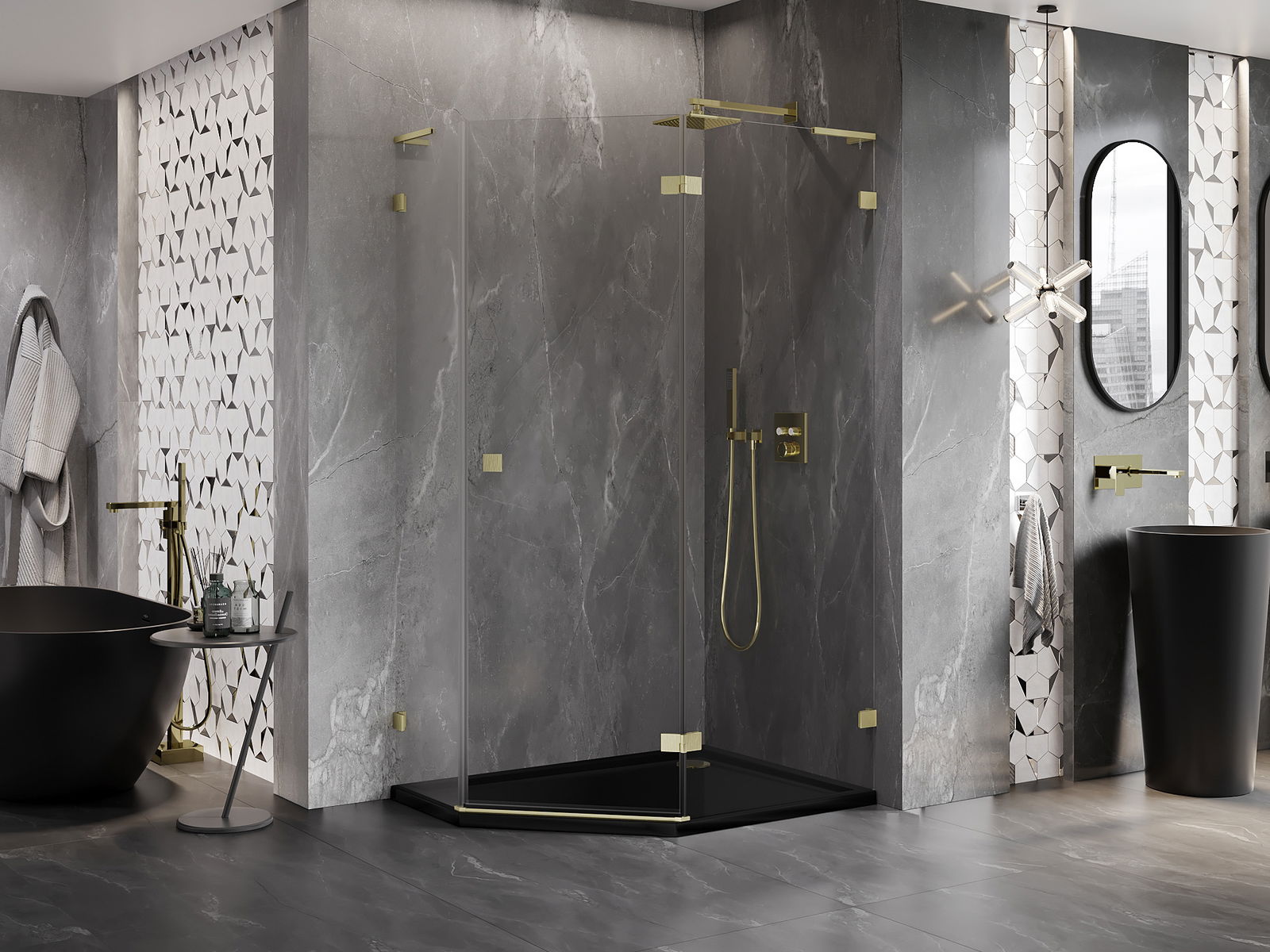 Mexen Lunar L cabina de ducha pentagonal abatible derecha 100 x 90 cm, transparente, oro cepillado - 831L-100P-090L-55-00-P