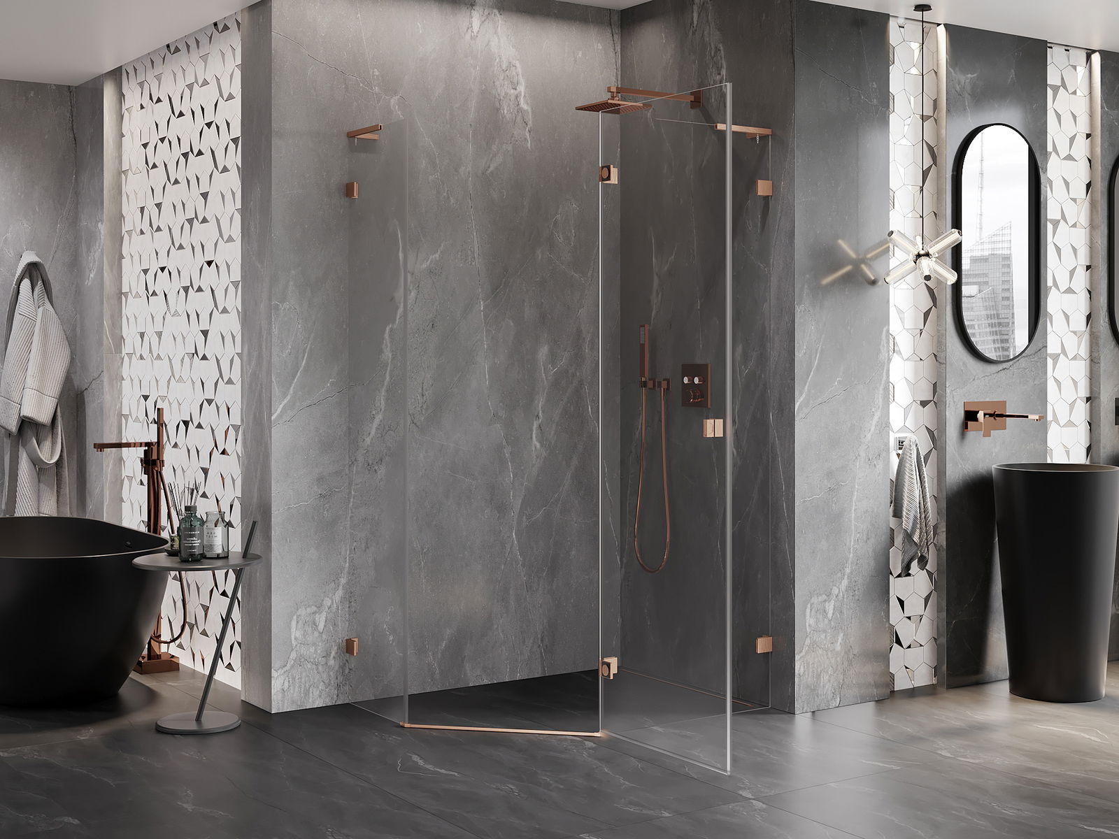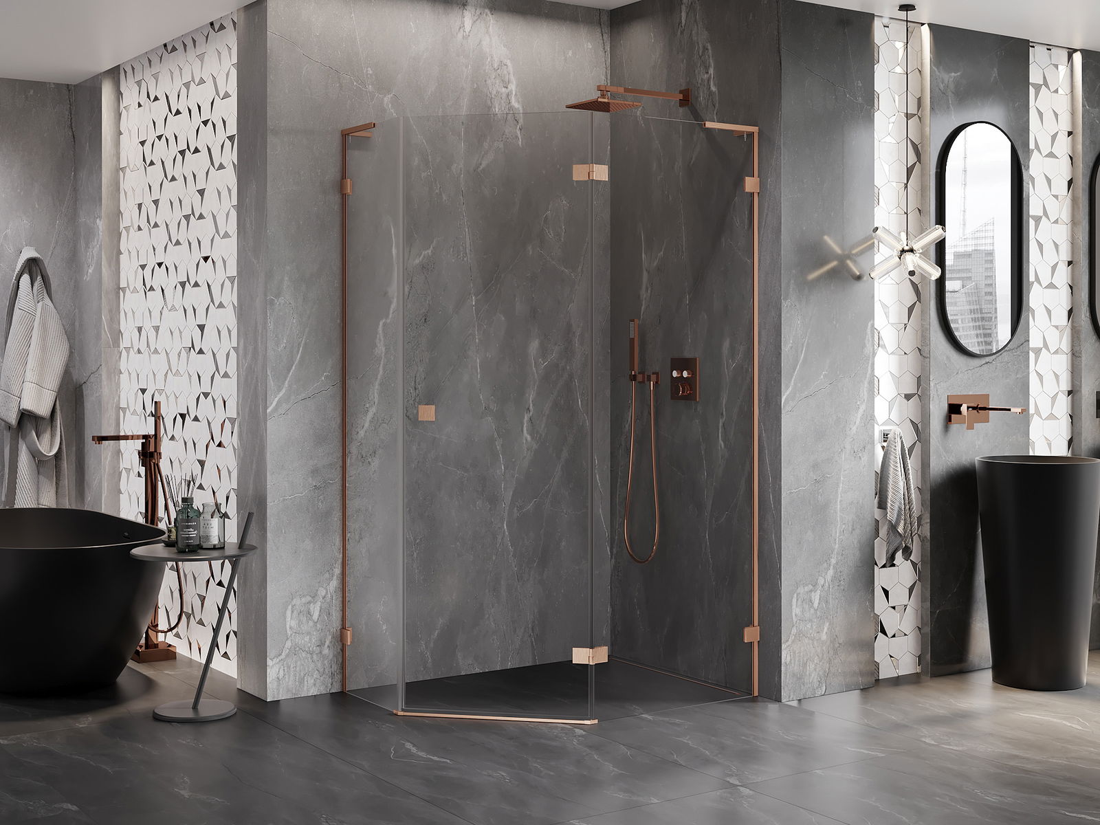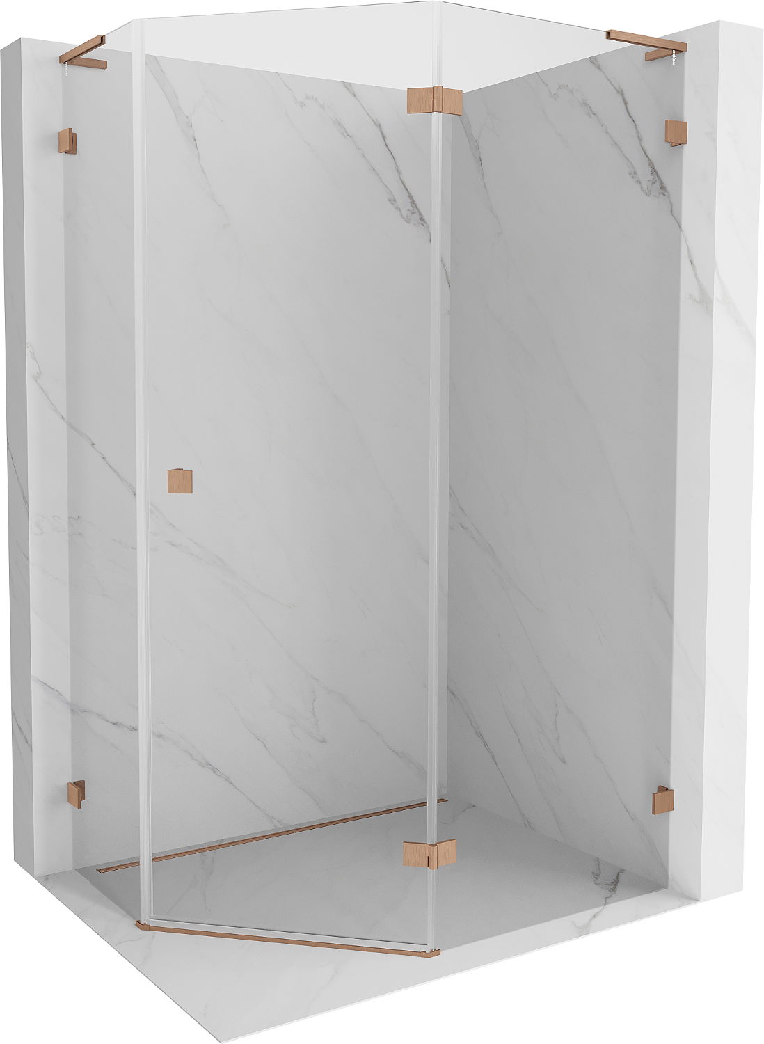 Mexen Lunar L cabina de ducha pentagonal abatible derecha 100 x 80 cm, transparente, cobre cepillado - 831L-100P-080L-65-00-P