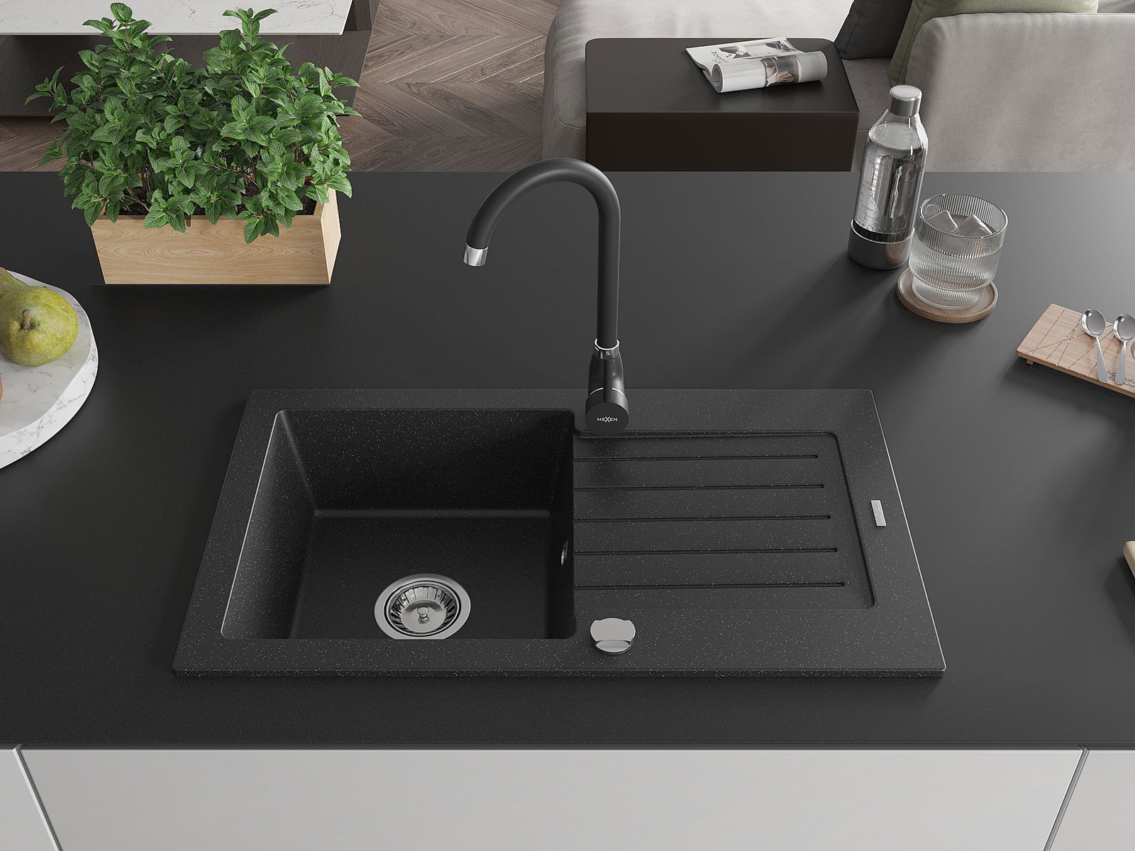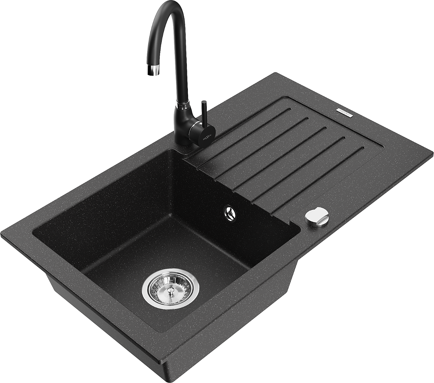 Mexen Pablo fregadero de granito 1-tazón con escurridor y grifo de cocina Telma, negro/plata - 6510-73-670200-70
