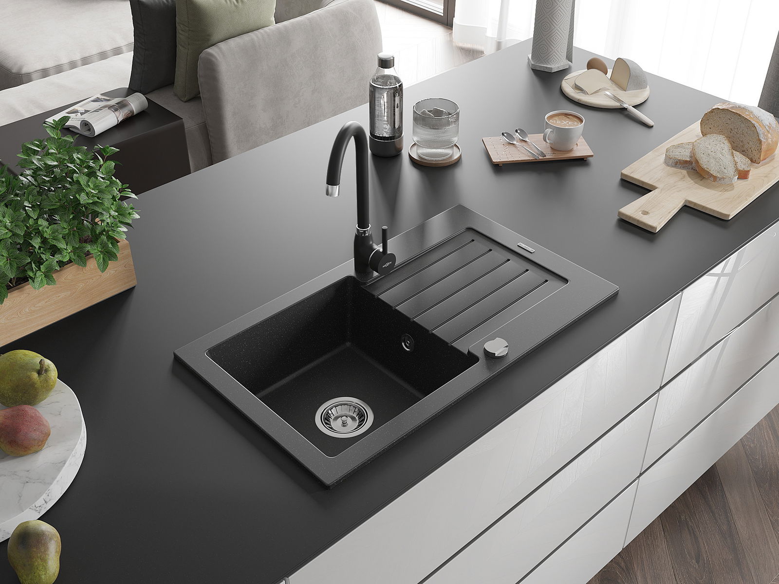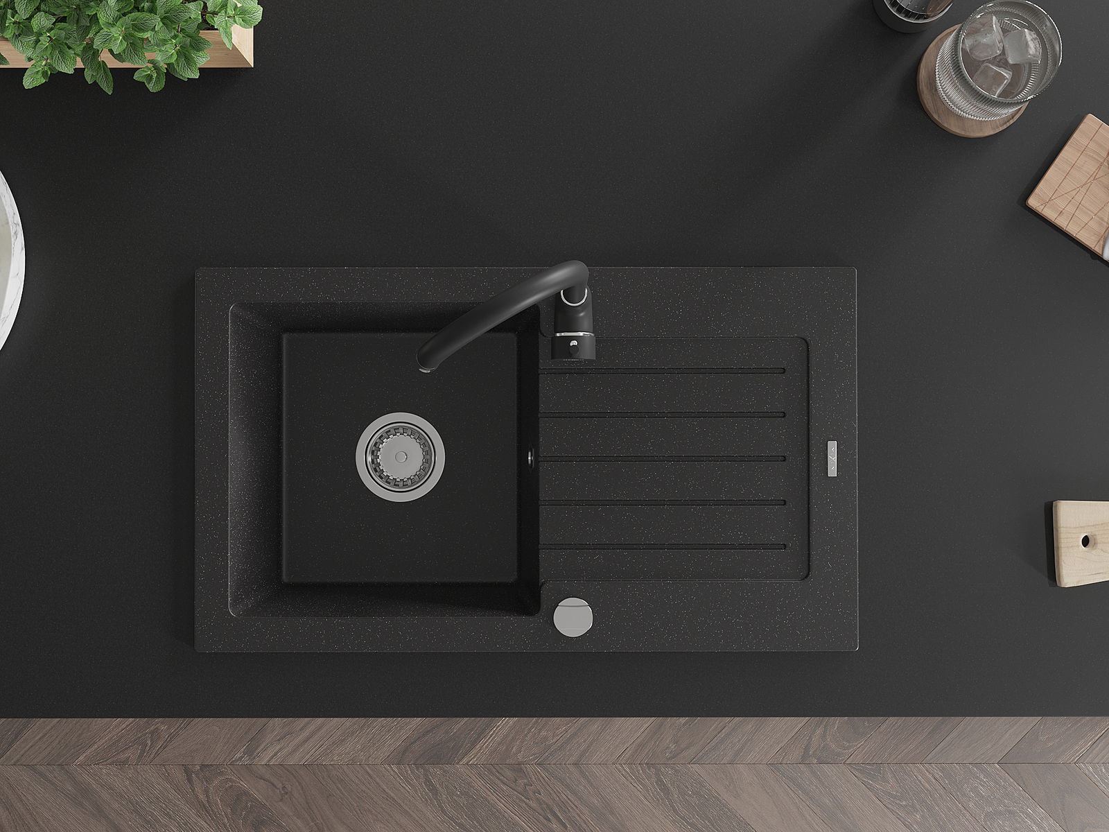 El fregadero está hecho de granito de alta calidad. Es un complemento elegante y, sobre todo, práctico para cualquier cocina, independientemente de su estilo. La alta calidad y durabilidad del granito aseguran un uso prolongado durante años.