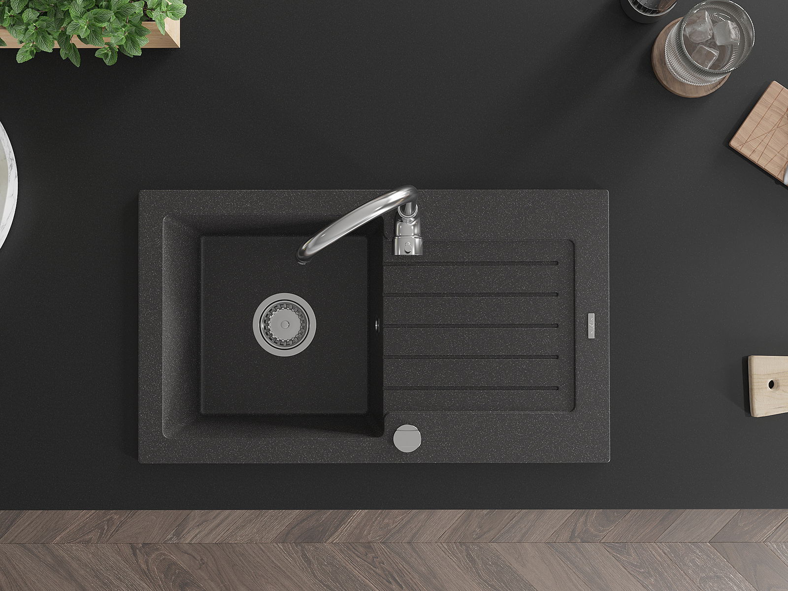 El fregadero está hecho de granito de alta calidad. Es un complemento elegante y, sobre todo, práctico para cualquier cocina, independientemente de su estilo. La alta calidad y durabilidad del granito aseguran un uso prolongado durante años.
