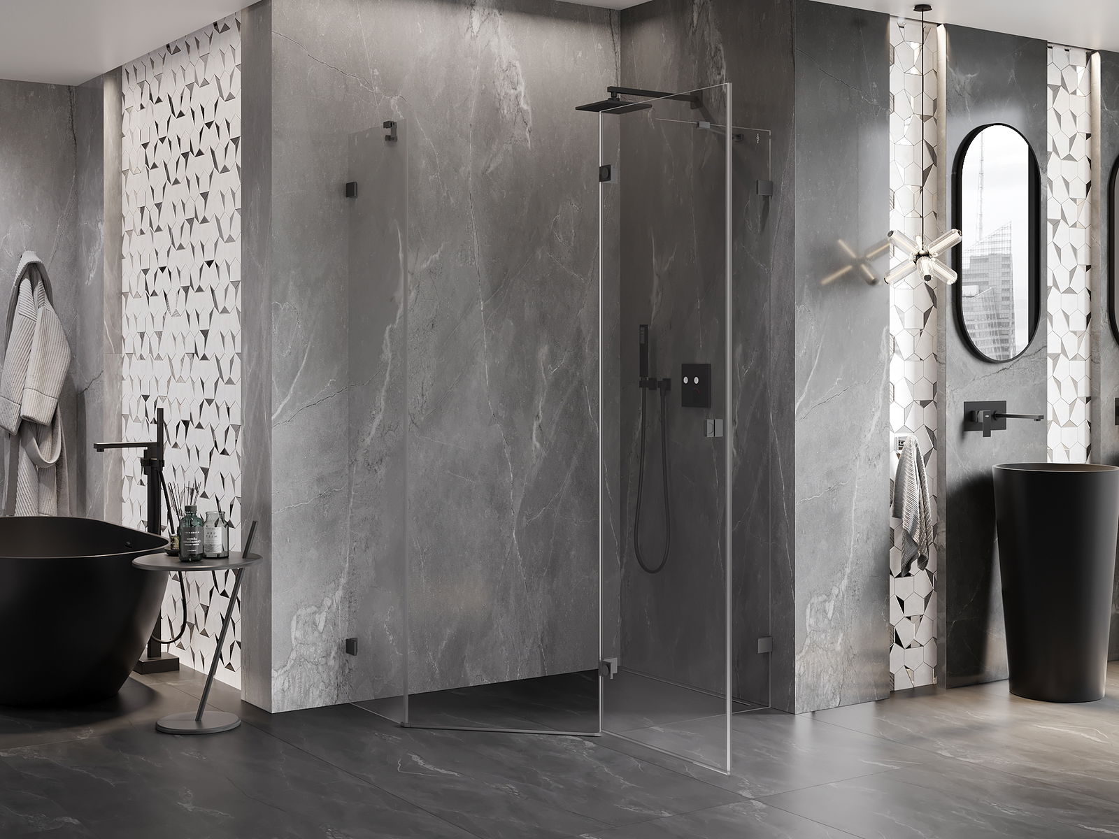 Mexen Lunar cabina de ducha pentagonal abatible derecha 90 x 80 cm, transparente, gun metal - 831-090P-080L-95-00-P