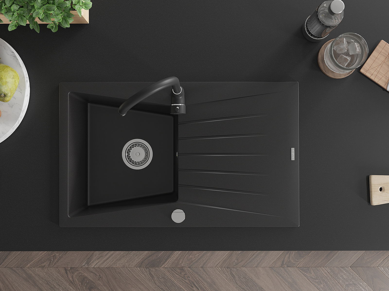 Mexen Cesar fregadero de granito de 1 cubeta con escurridor y grifo de cocina Telma, negro - 6514-77-670200-70