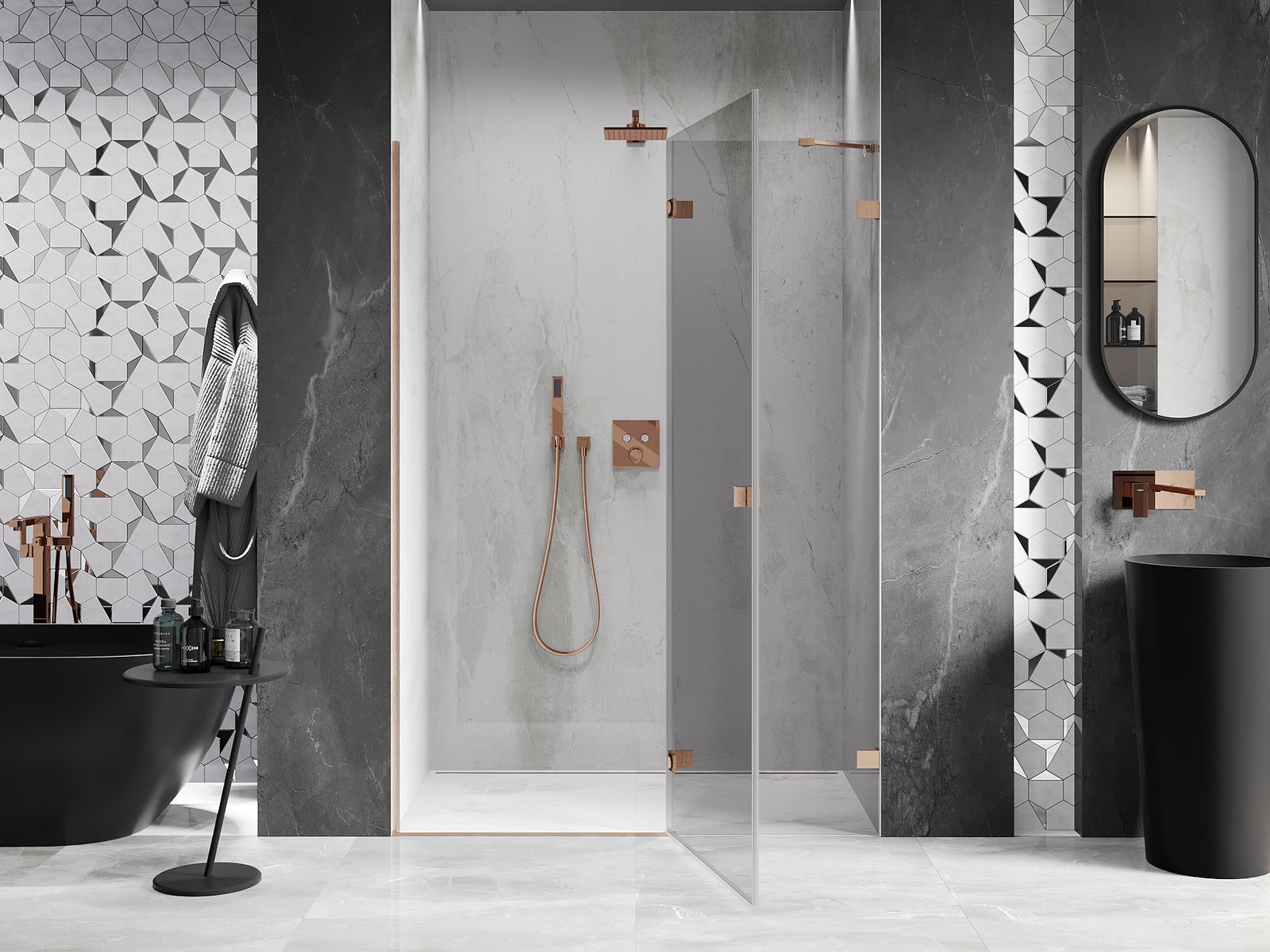 Las abrazaderas y bisagras están hechas de latón muy duradero, y además crean una superficie de vidrio al ras. Es una excelente opción que combina elegancia, durabilidad y diseño moderno. Gracias a tales soluciones, la ducha gana en estética y, al mismo tiempo, facilitan el mantenimiento de la limpieza.