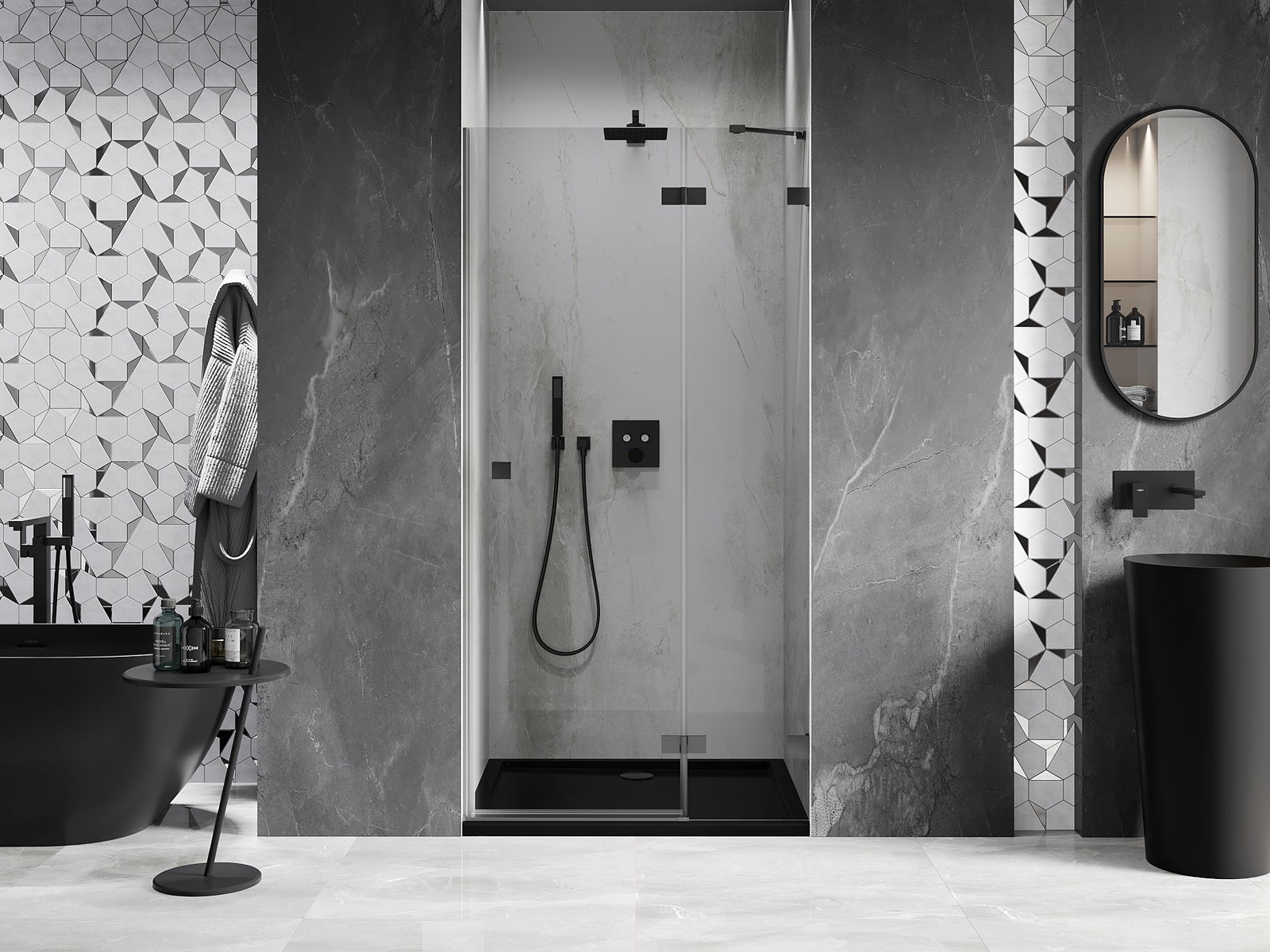 Las puertas abatibles permiten la máxima libertad durante su uso. Cuentan con bisagras sólidas hechas de un material duradero, que no presentan dificultades para mantener la limpieza y permiten un fácil acceso al interior de la cabina.