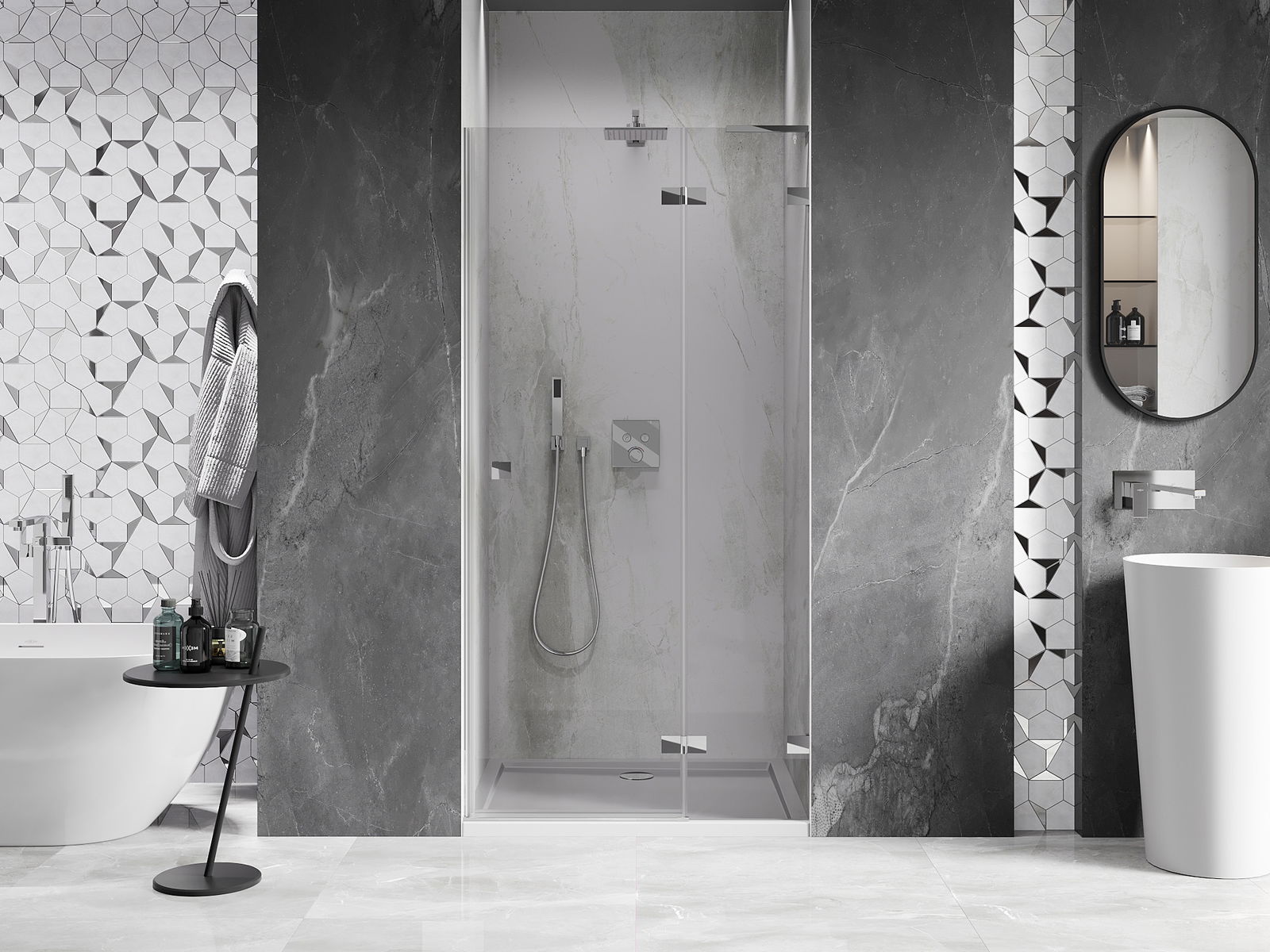 Un asa práctico y cómodo hecho de metal duradero y resistente. La forma moderna combinada con un acabado que se adapta al color de los perfiles le da a todo un aspecto moderno y estilizado, destacando la estética de cada baño.