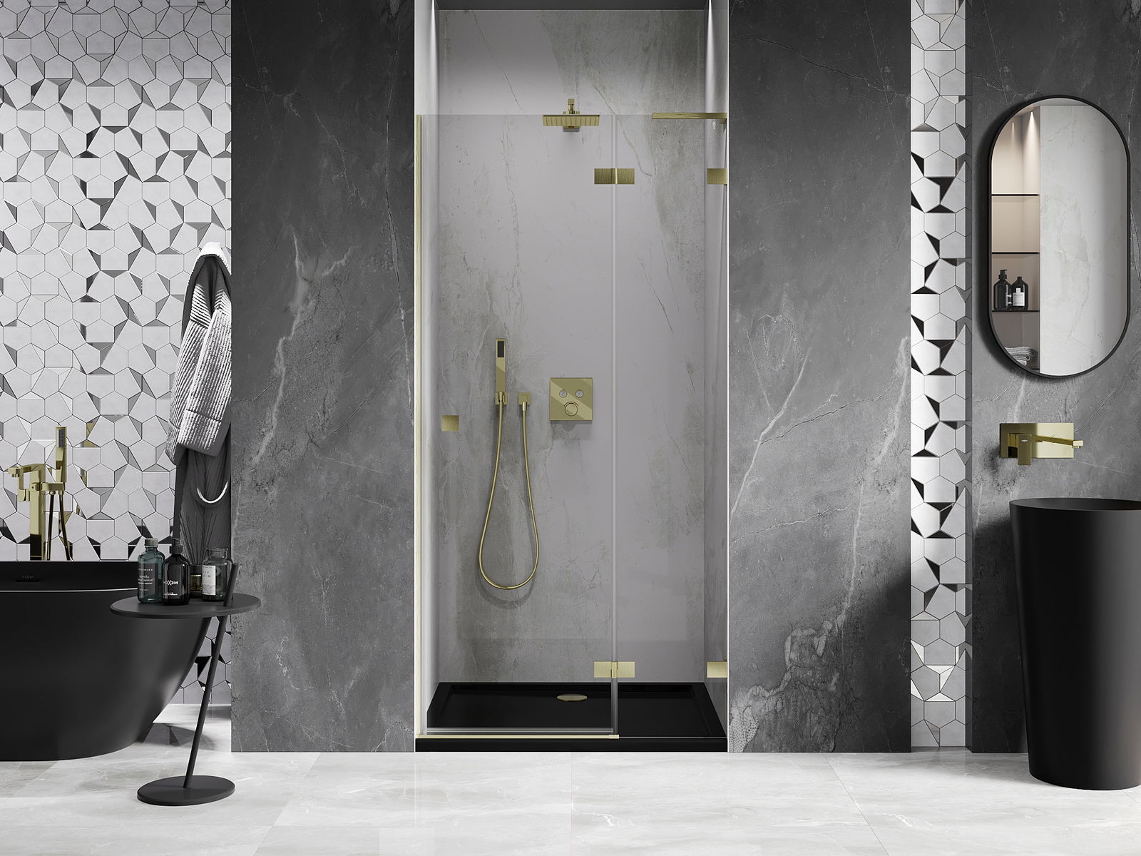 Las abrazaderas y bisagras están hechas de latón muy duradero, y además crean una superficie de vidrio al ras. Es una excelente opción que combina elegancia, durabilidad y diseño moderno. Gracias a tales soluciones, la ducha gana en estética y, al mismo tiempo, facilitan el mantenimiento de la limpieza.