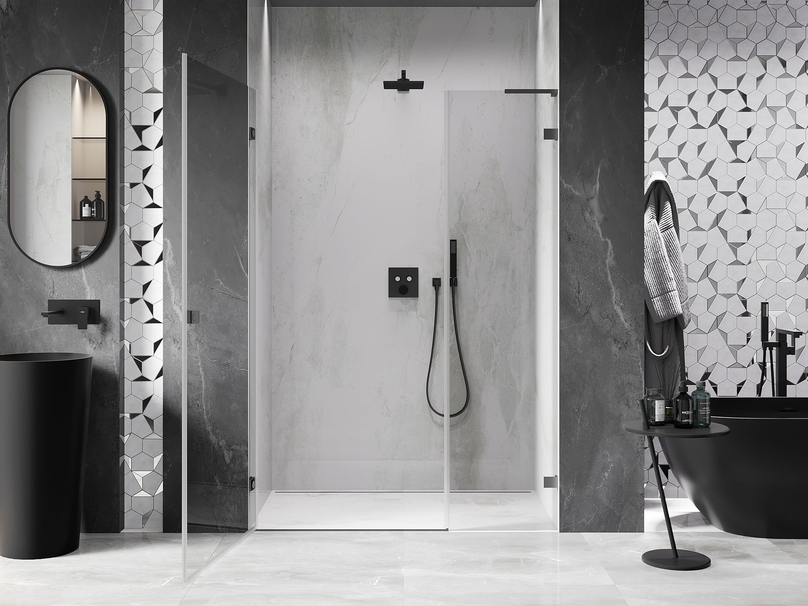 Un asa práctico y cómodo hecho de metal duradero y resistente. La forma moderna combinada con un acabado que se adapta al color de los perfiles le da a todo un aspecto moderno y estilizado, destacando la estética de cada baño.