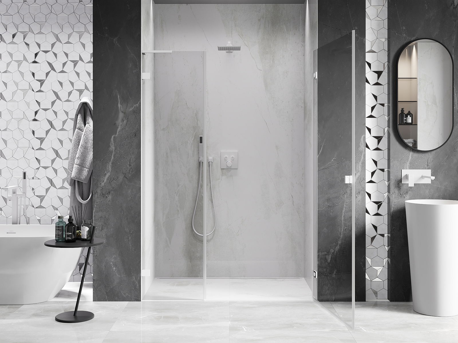 Un asa práctico y cómodo hecho de metal duradero y resistente. La forma moderna combinada con un acabado que se adapta al color de los perfiles le da a todo un aspecto moderno y estilizado, destacando la estética de cada baño.