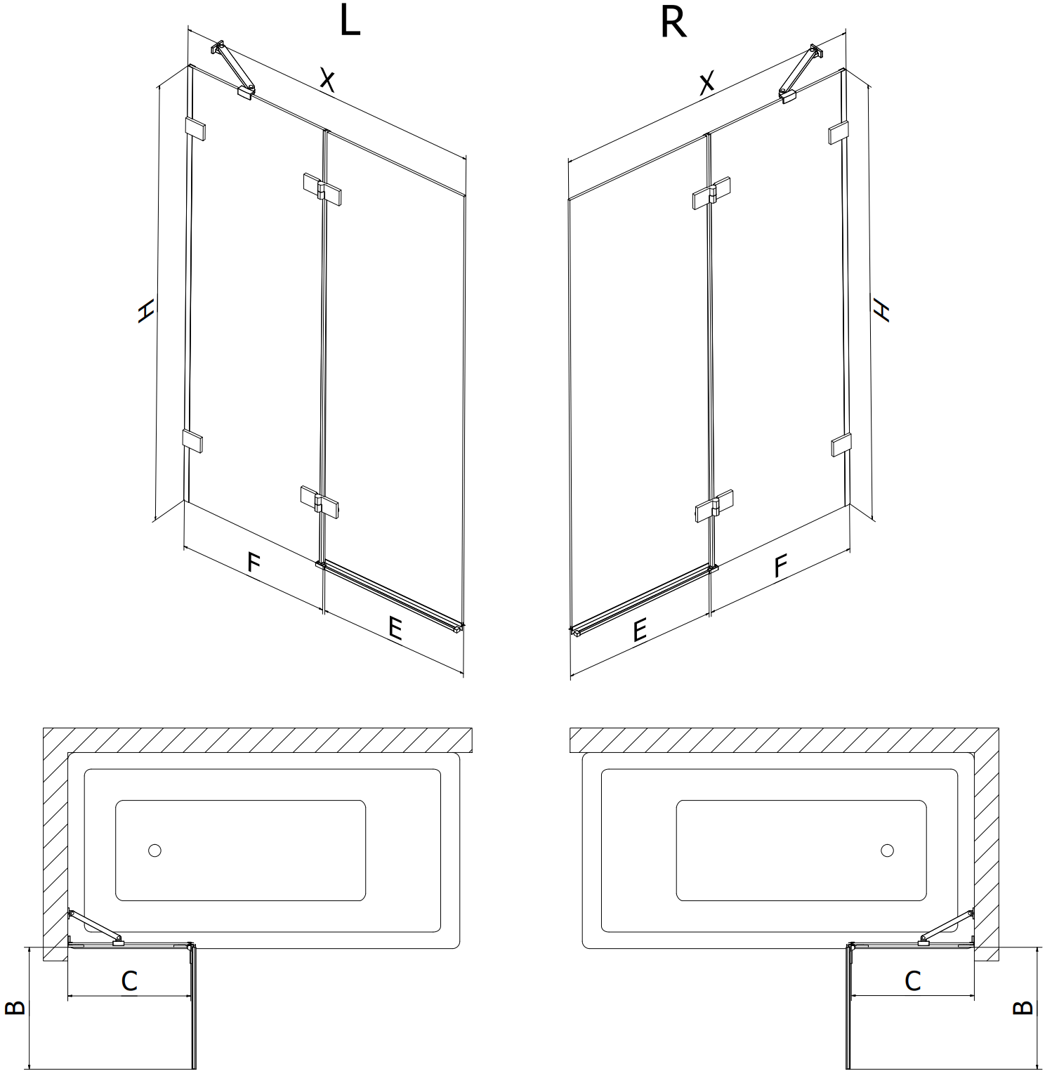 Paraván hecho de dos hojas con posibilidad de plegado. Esta solución permite ahorrar más espacio en el baño y permite el uso libre del espacio restante cuando no estamos usando la zona de baño.