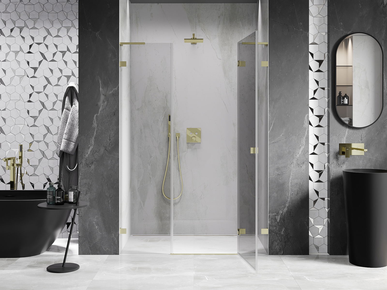 Las abrazaderas y bisagras están hechas de latón muy duradero, y además crean una superficie de vidrio al ras. Es una excelente opción que combina elegancia, durabilidad y diseño moderno. Gracias a tales soluciones, la ducha gana en estética y, al mismo tiempo, facilitan el mantenimiento de la limpieza.