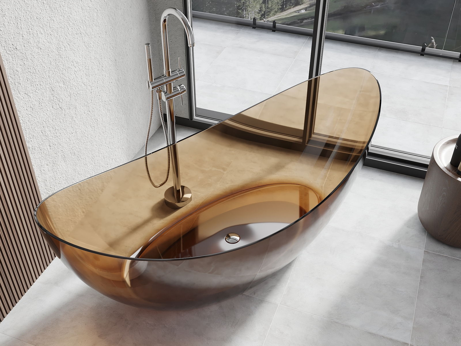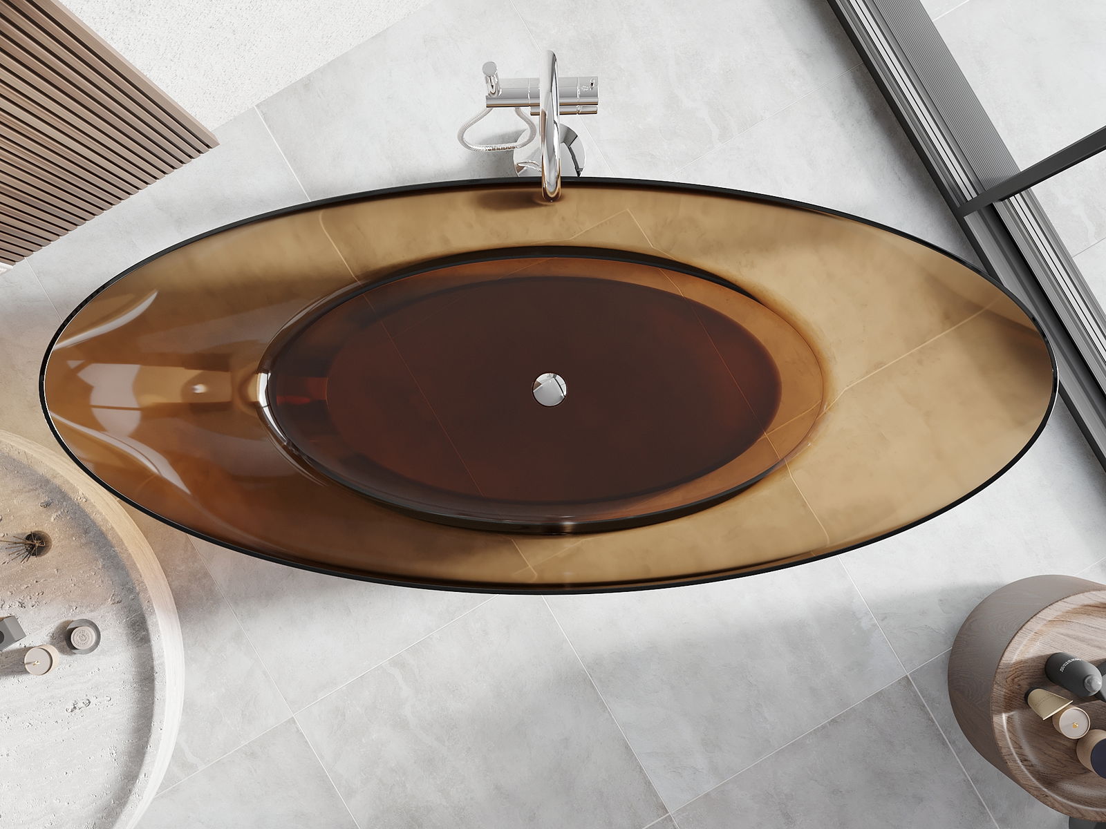 Es un material moderno que combina una apariencia elegante con alta durabilidad. Es resistente a daños mecánicos, fácil de limpiar y agradable al tacto. La forma transparente y el borde fino de la bañera le dan ligereza y un carácter único, creando un acento impresionante en el diseño del baño.
