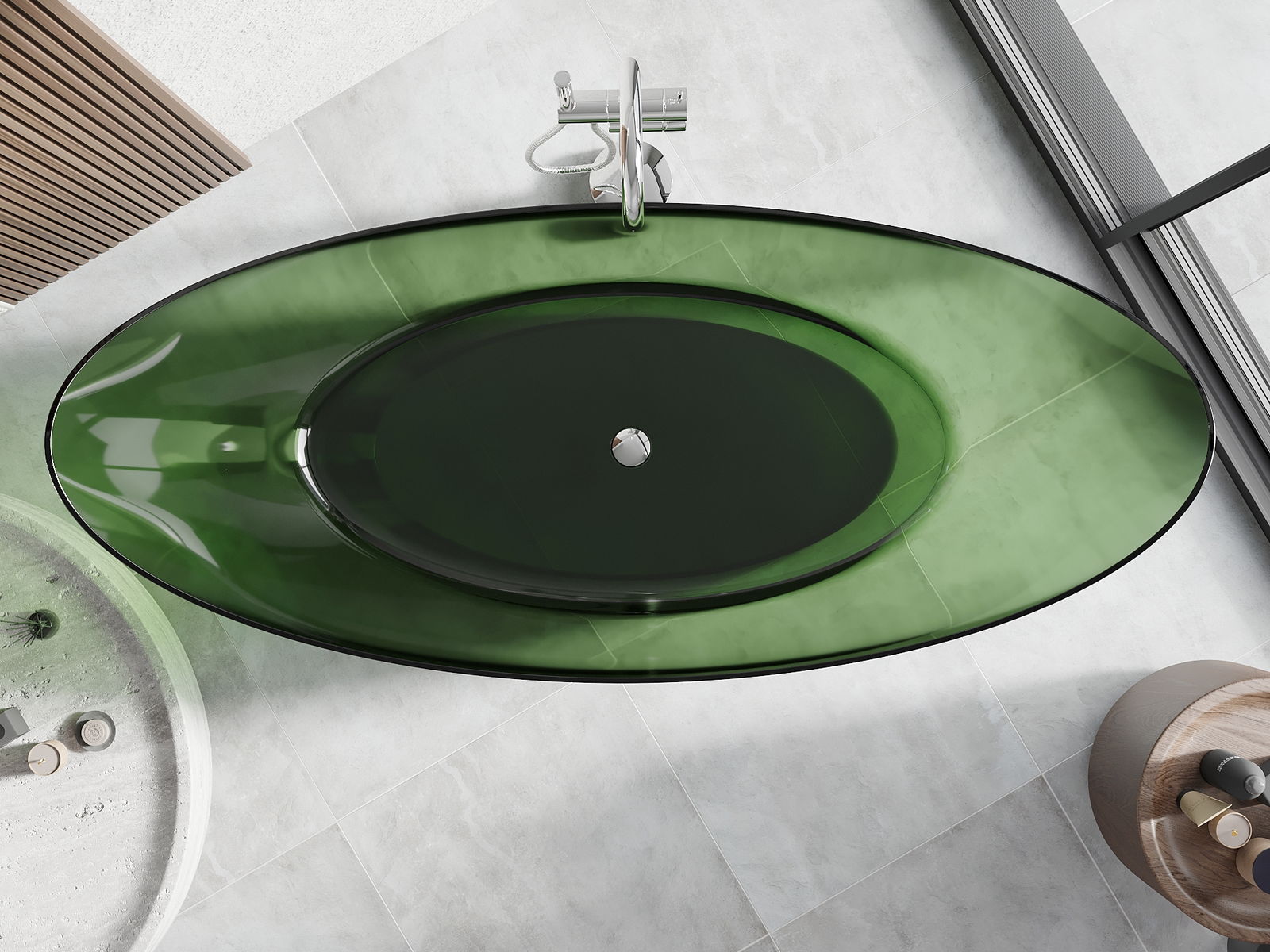 Es un material moderno que combina una apariencia elegante con alta durabilidad. Es resistente a daños mecánicos, fácil de limpiar y agradable al tacto. La forma transparente y el borde fino de la bañera le dan ligereza y un carácter único, creando un acento impresionante en el diseño del baño.