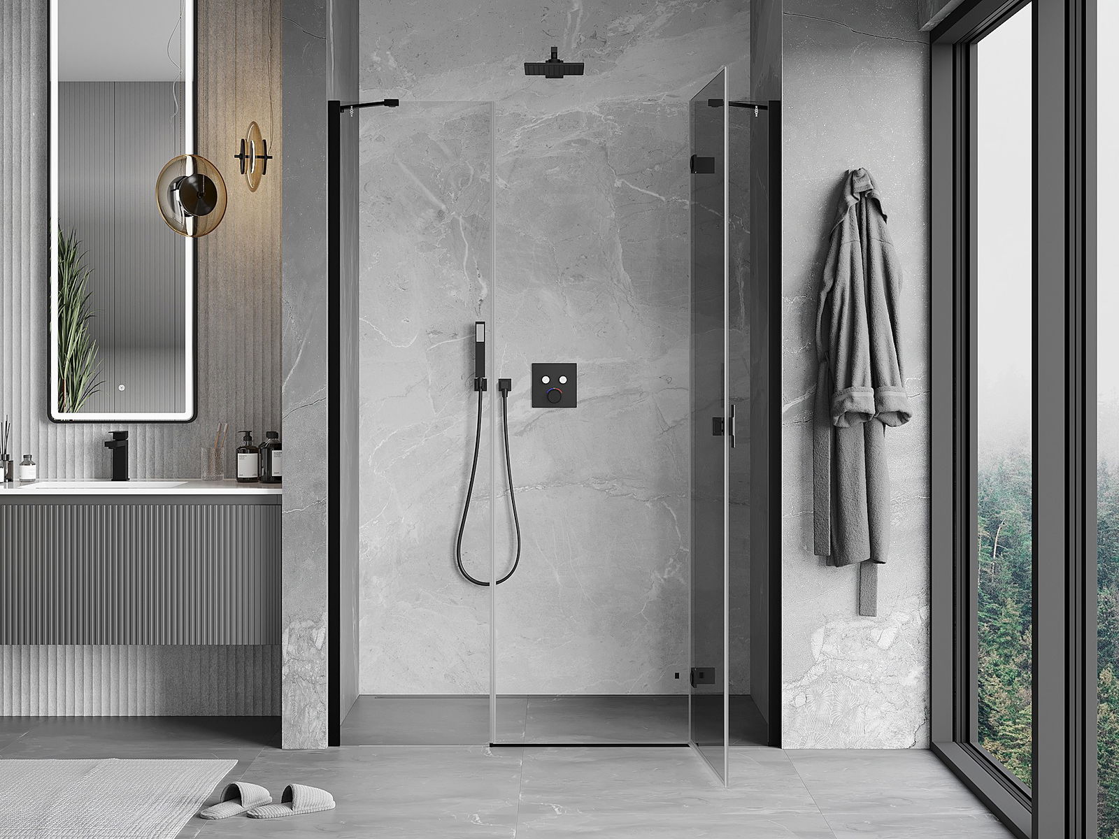 Las puertas abatibles permiten la máxima libertad durante su uso. Cuentan con bisagras sólidas hechas de un material duradero, que no presentan dificultades para mantener la limpieza y permiten un fácil acceso al interior de la cabina.