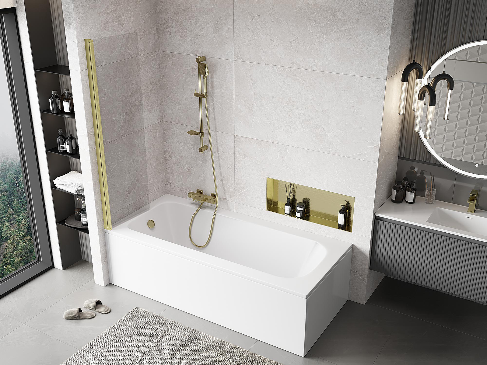 Protección efectiva contra el derrame de agua durante el baño. La mampara tiene juntas que se ajustan perfectamente a la superficie del vidrio y al borde de la bañera. Solución funcional que garantiza seguridad y facilidad de limpieza.