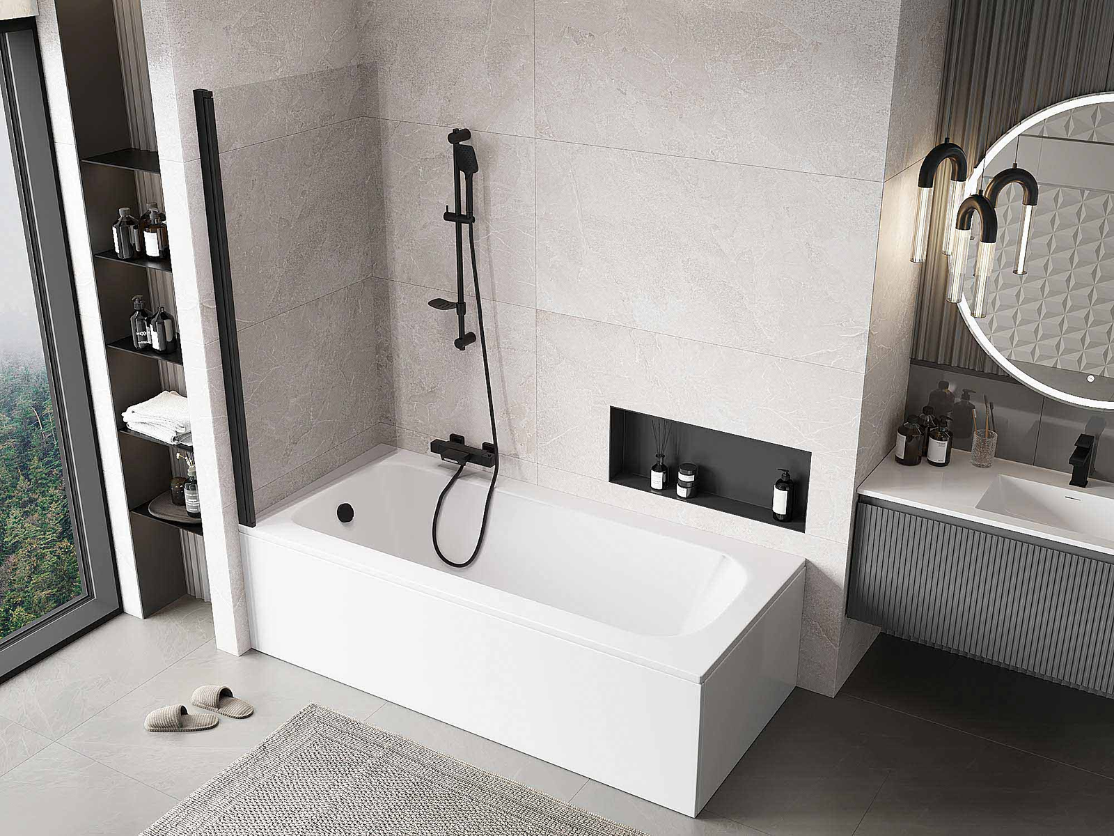Protección efectiva contra el derrame de agua durante el baño. La mampara tiene juntas que se ajustan perfectamente a la superficie del vidrio y al borde de la bañera. Solución funcional que garantiza seguridad y facilidad de limpieza.